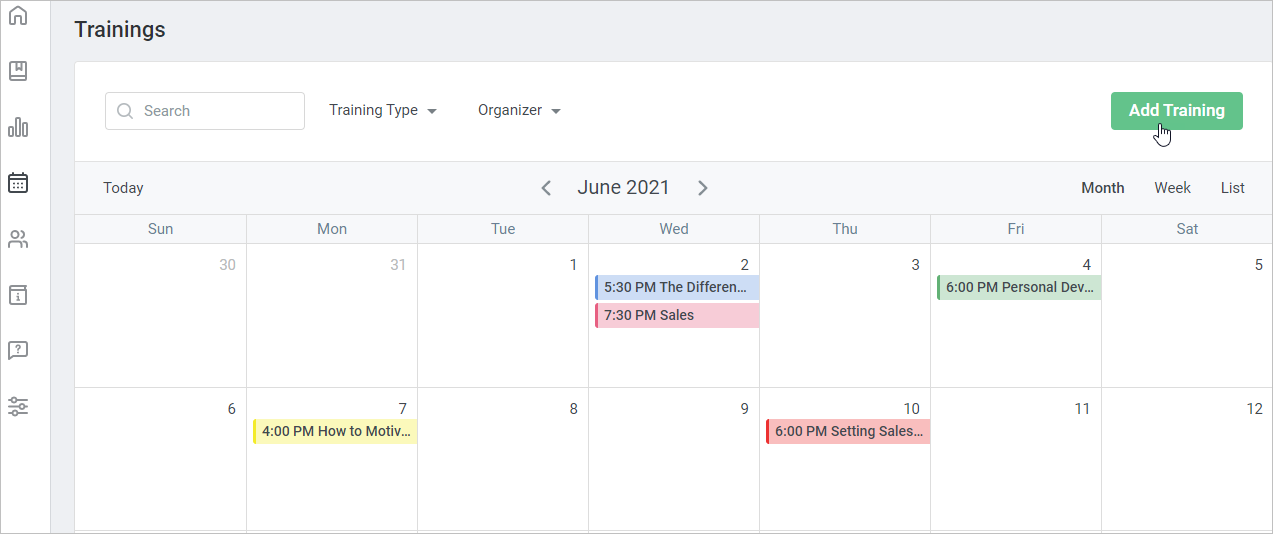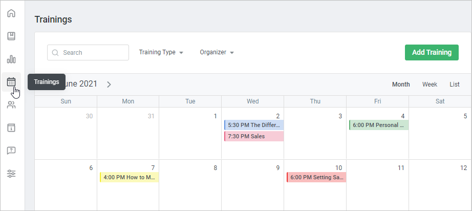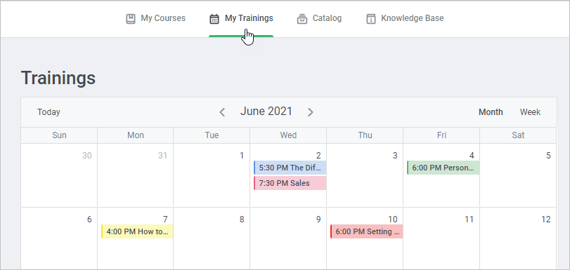 - See the scheduled trainings. All trainings will be highlighted in different colors depending on their type.