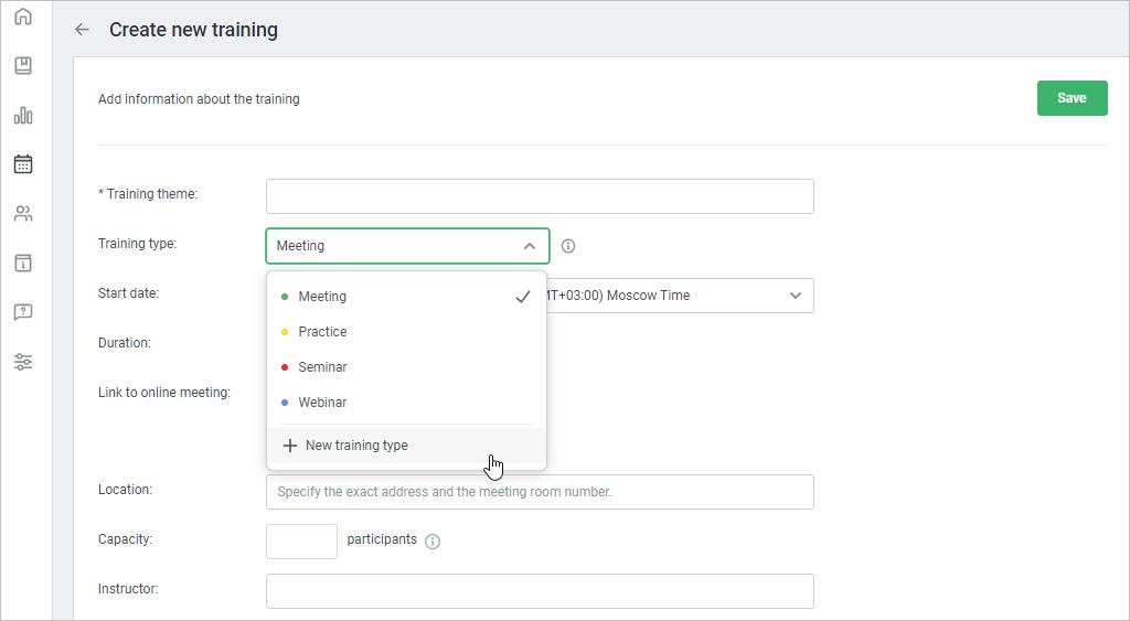 - Fill in all fields with the details of a training and click Save.