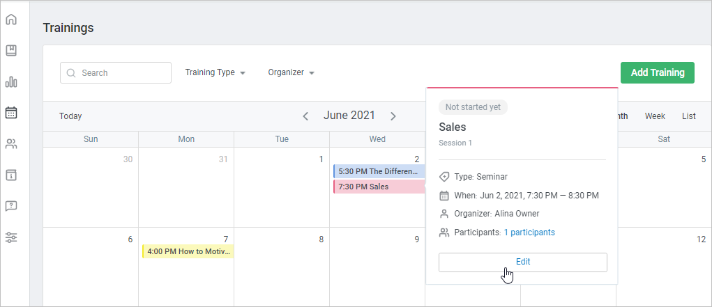 - In the calendar, choose the necessary training and click the Edit button in the opened window.