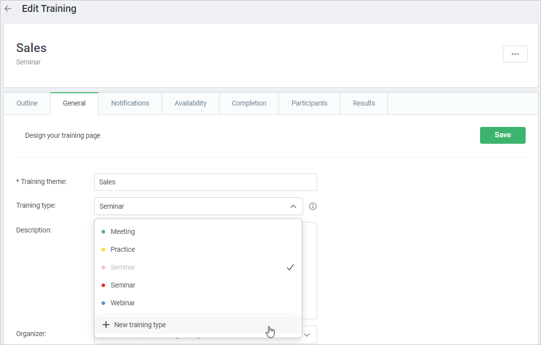 You can also create a new training type depending on your goals (a seminar, a lecture, or a course).