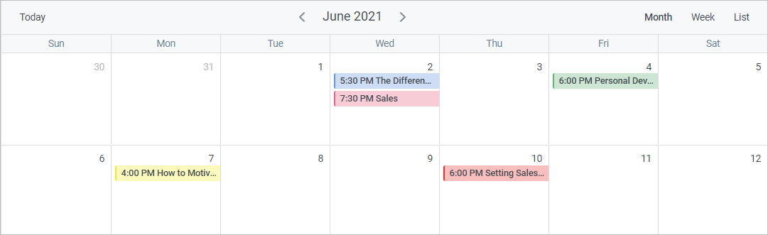 For example: You created a training type named Seminar, chose pink, and added several trainings related to this type.
