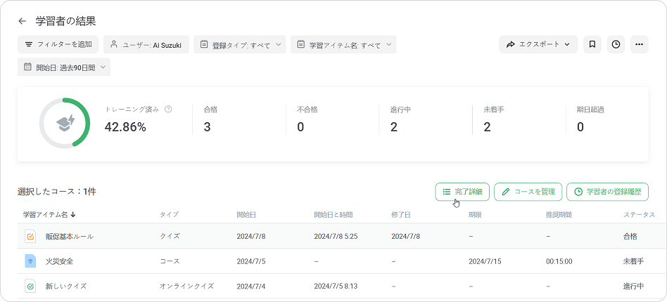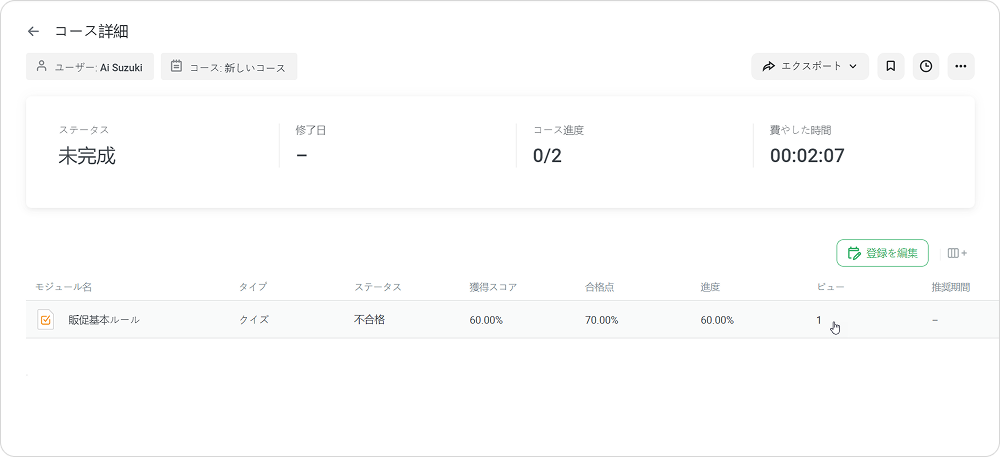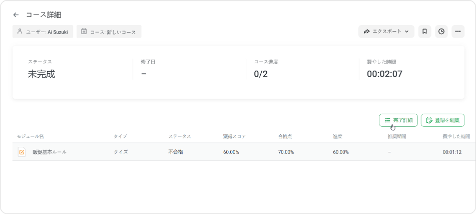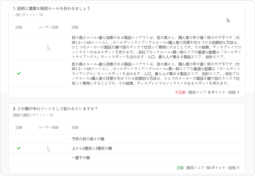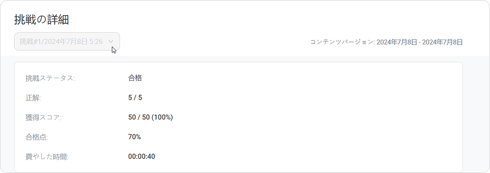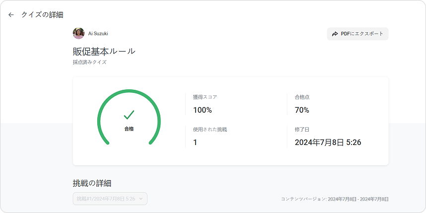 iSpring LMS レポート レポートタイプ Current: クイズと対話詳細 クイズと対話詳細 学習者がクイズ、対話、アンケートの質問にどれぐらい対応しているのかをチェックしましょう。 これは、ユーザーのスコアが低い理由を理解するのに役立ちます。 恐らく、質問を書き換えるか、追加でいくつか正解オプションを加えることができます。 クイズ、対話、アンケートのレポートを実行する方法:学習者の結果レポートに進むそれからクイズ、対話、またはアンケートを選択して完了詳細ボタンをクリックします。クイズ、対話、またはアンケートがコースに含まれている場合、最初にコース詳細レポートに移動します。 それから、必要なコンテンツアイテムを選択して完了詳細をクリックします完了結果のレポートが開きます。 ここでは、クイズに合格するためのすべてのテスト、対話、アンケート、合格点獲得のポイント数、完了日が表示されます。各質問に対するユーザーの回答を見ることができます:選択した回答オプション、獲得したポイント数、使用したテストのほか、質問テキスト、正解オプションリスト。 挑戦の詳細セクションでは、すべてのユーザーのテスト結果を見ることができます。 「最後」としてマークされているテストは、ユーザーの一番良いテストです。 レポートはクイズ、対話、アンケートのすべてのバージョンで構成されます。レポートには、予定されていない自動登録やラーニングトラック内で計画された登録ではなく、ユーザーにすでに割り当てられたコンテンツアイテムのみ含まれます。すでに合格している登録をキャンセルして、学習者にコンテンツアイテムを再割り当てする場合、レポートには後からの登録に関する詳細が含まれます。クイズや対話詳細のレポートはPDFにエクスポートしてから、メール送信/印刷が可能です。 <レポートをPDFにエクスポートに関する記事で、追加方法について知りましょう。iSpring QuizMakerでは、合格テストの最大数は結果スライドで指定されます。iSpring TalkMasterでは、対話シミュレーションを再生するオプションは、再生とプレーヤー設定のナビゲーションセクションで有効にできます。学習者が開く際には、クイズと対話シミュレーションビューはインスタンスです。クイズやシミュレーションがコース詳細レポートで何度表示されるのかを確認します(クイズ/シミュレーション詳細レポートより先に来ます)。次の状況を想像してください:学習者がクイズを開いてスライドを3つ見て、2問回答してクイズを閉じました。 数時間後、クイズを再開して完了させました。クイズには2回の表示と1回の合格テストがあることになります。別の例を挙げましょう:学習者がクイズを1つ完了させましたが、合格点を得られず、最終スライドでクイズをもう一度受けるボタンをクリックし、2回目にクイズに合格しました。この場合、クイズには1回の表示と2回の合格テストがあることになります。同じロジックは、対話シミュレーション表示と合格テストの計算にも適用されます。 ×