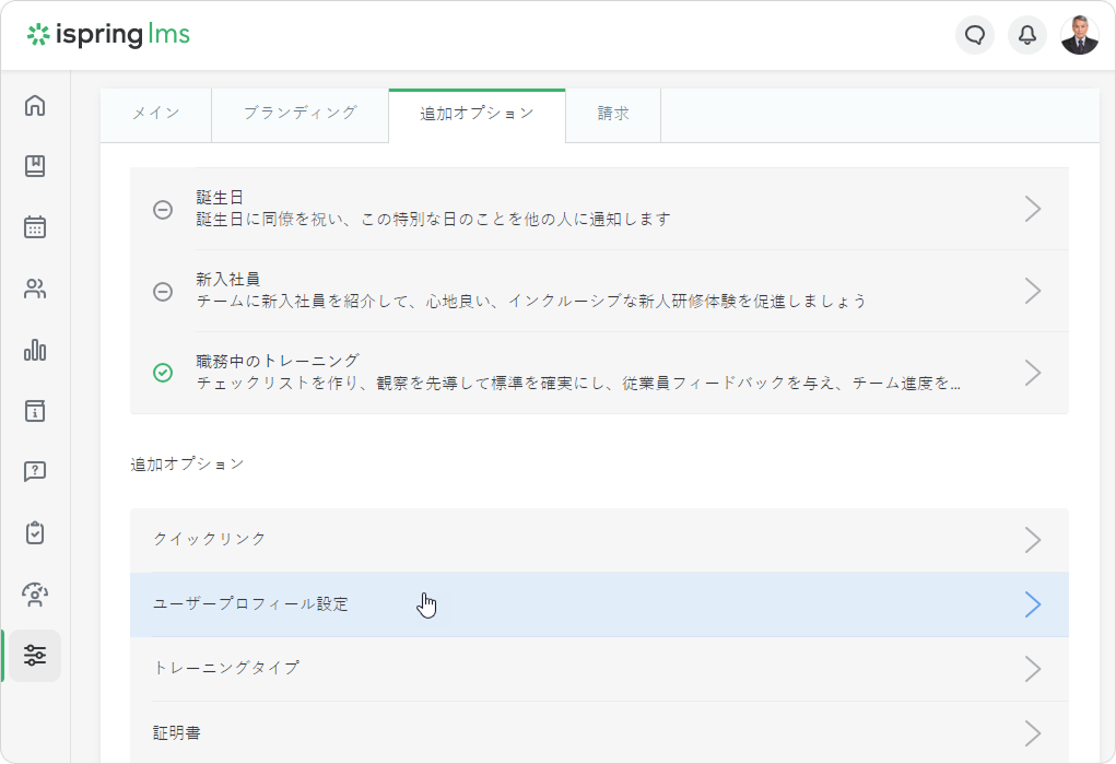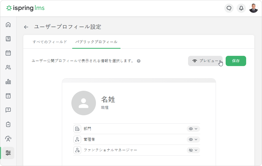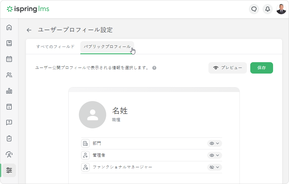 iSpring LMS 設定 追加のオプション ユーザープロフィール設定 Current: パブリックプロフィール パブリックプロフィール パブリックプロフィールはiSpring LMSビジネスプランでのみ利用できます。 設定 > 追加オプション > ユーザープロフィール設定に移動しますパブリックプロフィールタブに切り替えます部門、上司、ファンクショナルマネージャーフィールドを表示するか非表示にするにするかを選択しますご希望のフィールドを追加します プロフィール写真、ユーザー名、職種、部門、上司、ファンクショナルマネージャーフィールドはデフォルトで追加されます。ログインとすでに追加されているフィールドを除き、すべてのフィールドタブからいずれかのフィールドを追加できます。 不要なフィールドを削除しますフィールドのアイコンを変更しますリストからアイコンを選択できます。フィールドをドラッグして順序を変更し、別のセクションに移動しますパブリックプロフィールをプレビューすることも可能です右側で外観を確認できます。行った変更を保存してください パブリックプロフィールはユーザーポータルと組織図で同じものが表示されます。 ×