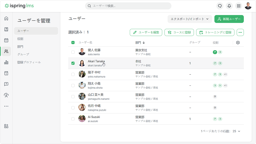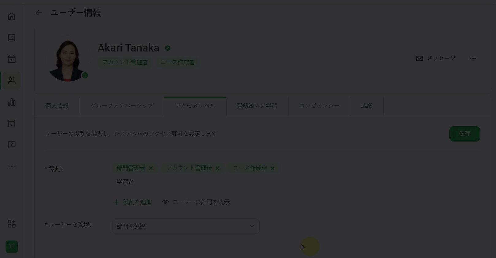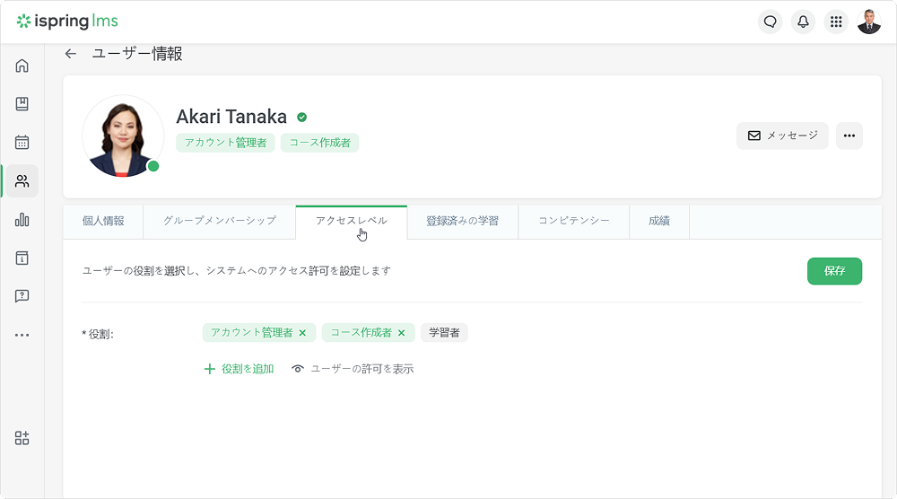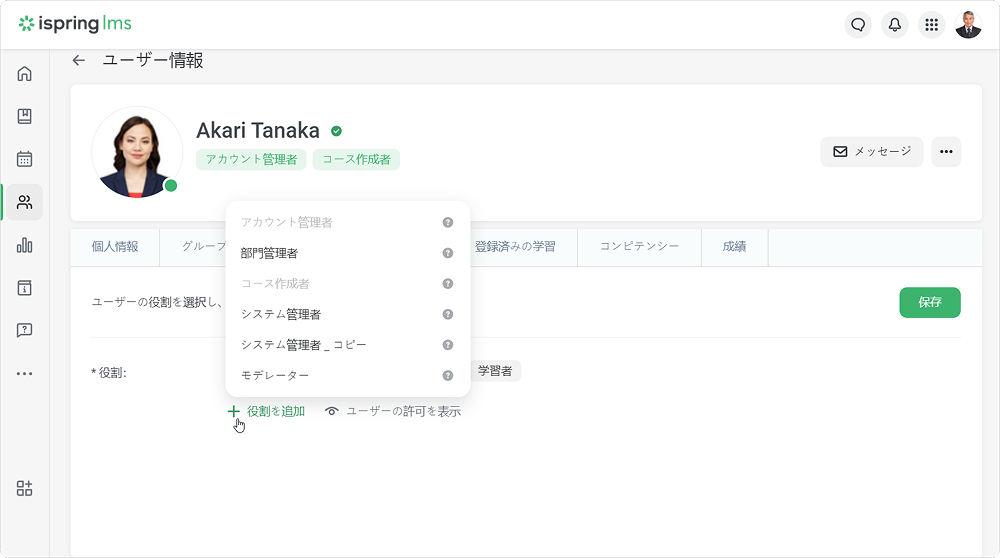iSpring LMS ユーザー ユーザー管理 ユーザーの編集 Current: ユーザーの役割変更 ユーザーの役割変更 ユーザーにはアカウント所有者以外の他の役割や複数の役割を割り当てることができます。ユーザーセクションに移動し、役割を変更したいユーザーをクリックしますそれからアクセスレベルタブを開きますデフォルトでは、すべてのユーザーに学習者の役割が割り当てられます。 つまり、ユーザーはコースを学べるポータルにアクセスがあります。学習者の役割のほかに、ユーザーに他の役割を選択できます:アカウント管理者、部門管理者、コース製作者、カスタムロールのひとつ。 これを実行するには、役割を追加リンクをクリックし、ひとつ以上役割を選択します。 部門管理者の役割か、カスタムロールのひとつを割り当てる場合、ユーザーが管理する部門を指定してください。最後に保存をクリックします 注意:ユーザーをアカウント管理者か部門管理者の役割に割り当てる場合、コース製作者の役割が自動的に割り当てられます。コース製作者の役割からアカウント管理者か部門管理者の割り当てを解除する場合、もうコースを作成できなくなります。ユーザーが保有する許可を確認するには、「ユーザーの許可を表示」ボタンをクリックします。部門管理者やカスタムロールにユーザーを割り当てる場合、管理する部門を1つ以上選択してください。 ×