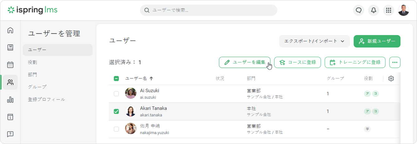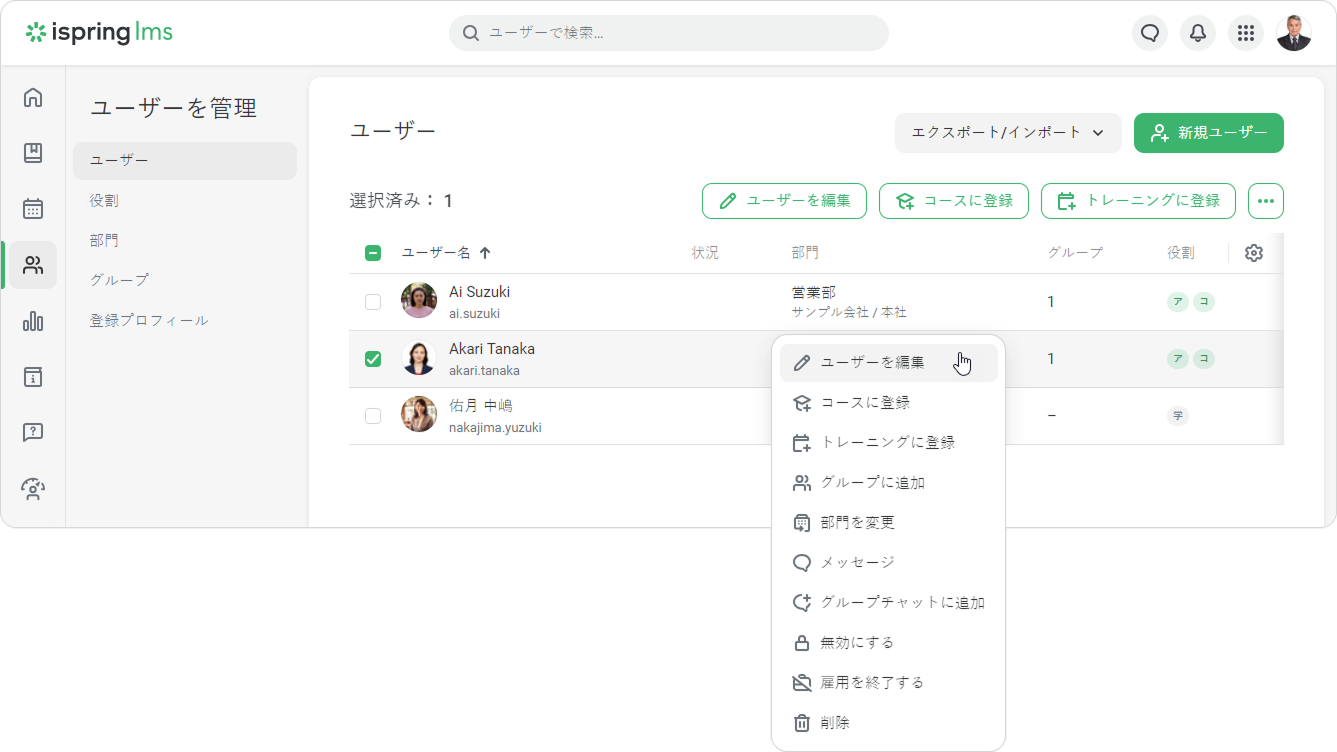 iSpring LMS ユーザー ユーザー管理 Current: ユーザーの編集 ユーザーの編集 ユーザーの編集ページでは次のアクションが可能です。 ユーザーを編集ページに進むには、リストのユーザー名をクリックします。またはコンテキストメニューを使用できます。 リストのユーザー名を右クリックし、ユーザーを編集を選択するだけです。 ×