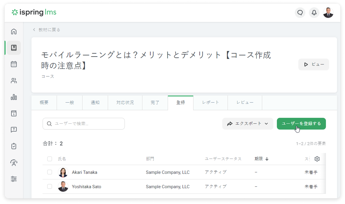 - コース編集ページで、登録タブを開きます。 それから、ユーザーを登録するをクリックします