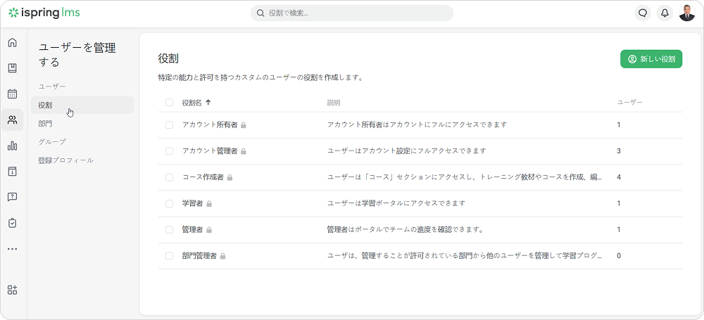 iSpring LMSには標準の役割が6つあります。