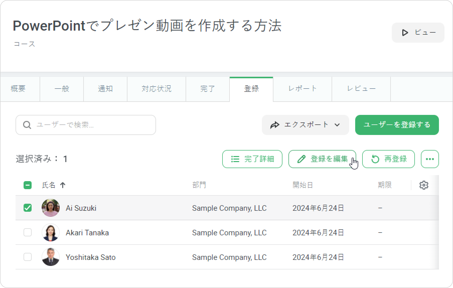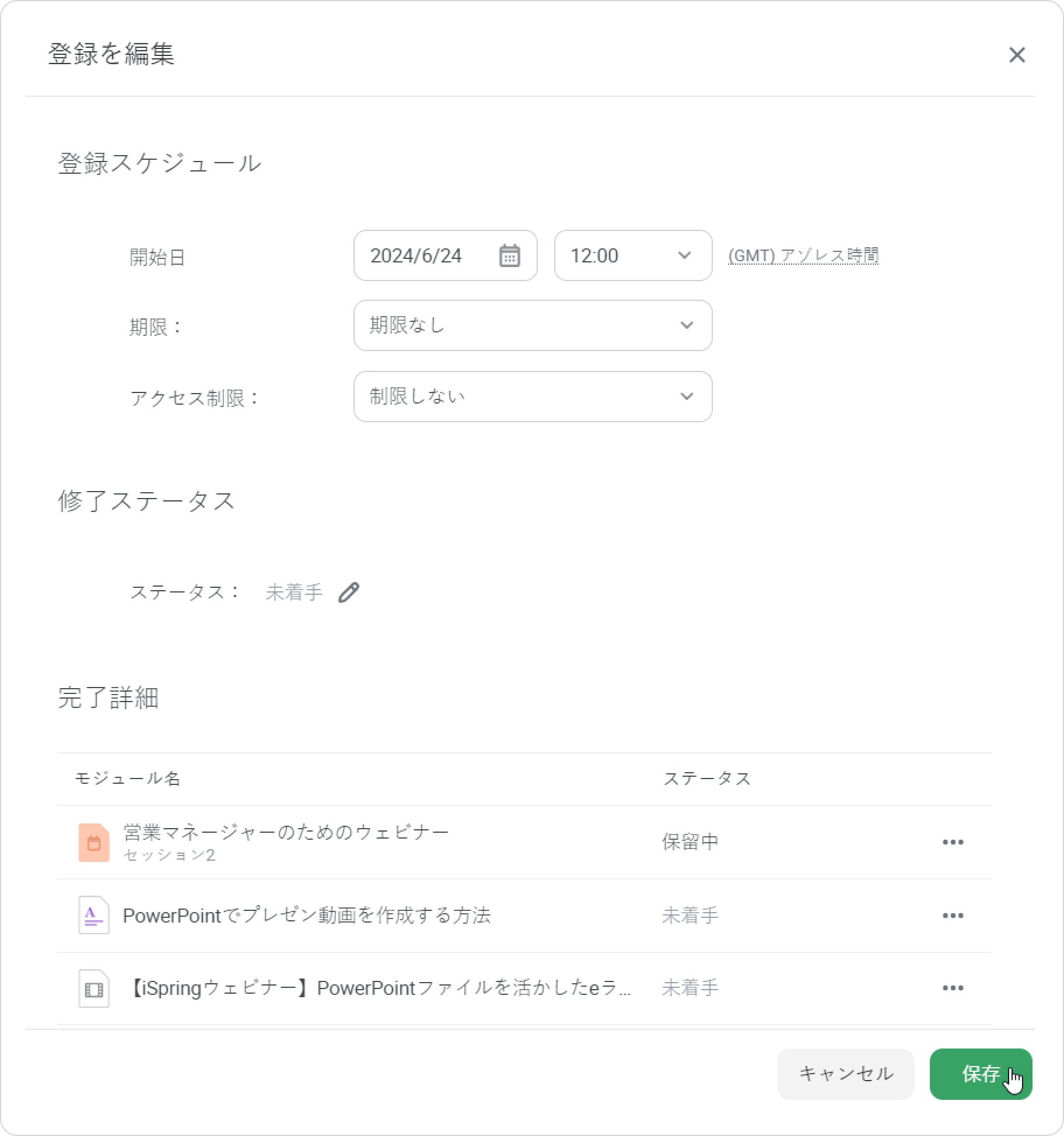 作成後、いつでもコースの登録パラメータを変更できます。 ユーザーがコンテンツを見れる期間を延長するか、開始日を遅らせたい場合に、このオプションは役立ちます。
