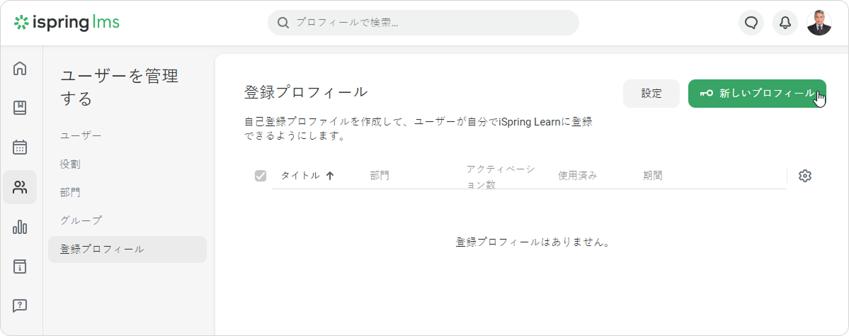iSpring LMS 設定 追加のオプション 新規登録 Current: 登録プロフィール 登録プロフィール 次の手順は登録プロフィールの作成で、次のものが含まれます。ユーザー登録リンクユーザーが属する部門期間アクティベーション数アカウント所有者、アカウント管理者、部門管理者、カスタムロール設定に従ってユーザー登録プロフィールを追加する許可を与えられたユーザーのみ、自己登録プロフィールを追加できます。部門管理者とカスタムロールがあるユーザーは、プロフィール作成時に自分が管理している部門と副部門のみ選択できます。 登録プロフィールの作成ユーザーセクションに移動して登録プロフィールタブを開き、新しいプロフィールをクリックしますプロフィールの登録フィールドを入力し、作成ボタンを押しますプロフィール名作成するプロフィールのタイトル部門このプロフィールからユーザー登録リンクで登録するユーザーは、この部門に属します期間この期間内はリンクが有効になります。学習者はそのリンクに従って、アカウントを登録しますアクティベーション数ユーザーがこのリンクを使ってアカウントに登録できる回数.プロフィールを追加できました。登録リンクをコピーして、学習者に配布しましょう登録プロフィールの編集ユーザー登録リンクをコピーして、いつでもプロフィールを編集できます。登録プロフィールタブに移動してプロフィールにチェックを入れ、編集をクリックしますここではプロフィール名、期間、アクティベーション数を変更し、プロフィールに別の部門を選択することができるほか、リンクアクティベーション履歴を表示できます プロフィールのアクティベーション履歴プロフィールアクティベーション履歴タブの下で、登録をすでに済ませている学習者を確認します。 履歴に自分が管理しない部門に属する学習者がいる場合、リストに非表示のユーザーがいるというメッセージが表示されます。 これは2つの理由によって起こる場合があります。自分が管理している部門に自己登録したユーザー。 後から自分が管理しない別の部門に移動されている。 登録プロフィール設定で選択されているため、自分が管理する部門に登録されているユーザー。 しかし、後からプロフィールが変更され、その部門が自分が管理していない部門に替わった。 登録プロフィールの削除プロフィールをもう必要としない場合には削除します。プロフィールや複数のプロフィールにチェックを入れて、削除をクリックしますそれから、プロフィールを削除ウィンドウで削除を確認します プロフィール登録に使用された部門を削除する場合、部門も削除されます。 ×