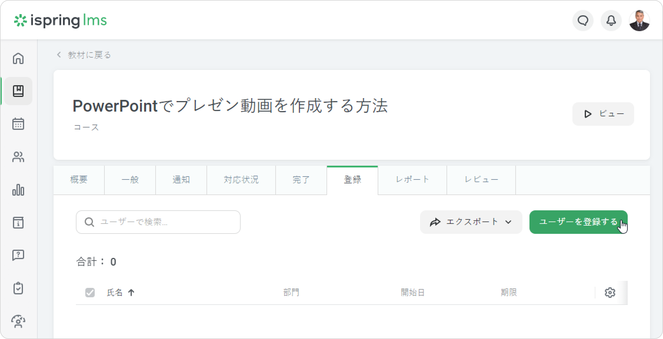 - コース編集ページで、登録タブを開きます。 それからユーザーを登録するボタンをクリックします