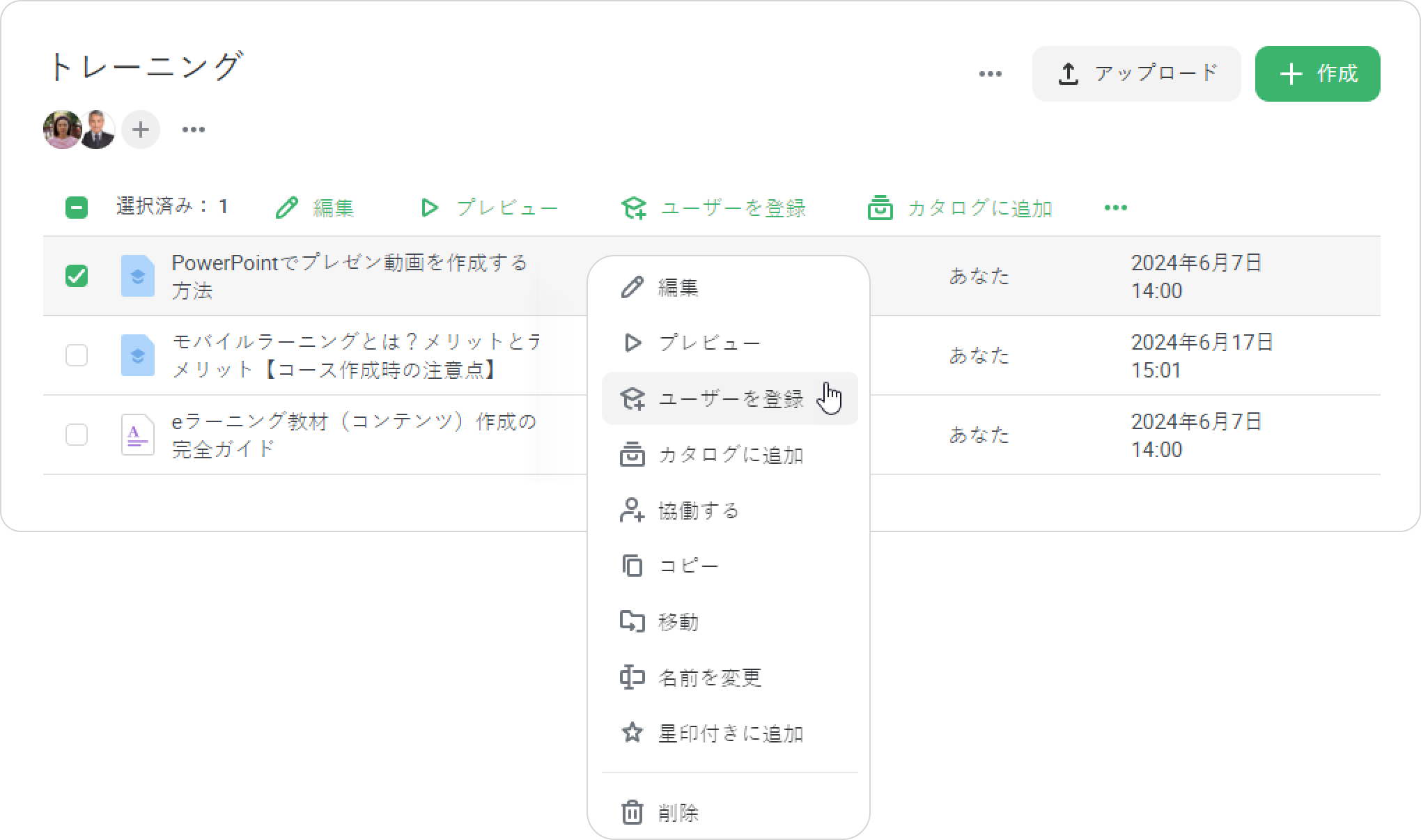 - 3番目の方法は、コースを右クリックし、コンテキストメニューでユーザーを登録を選択する方法です。 複数のコースを選択して、コンテキストメニューでユーザーを登録をクリックすることもできます