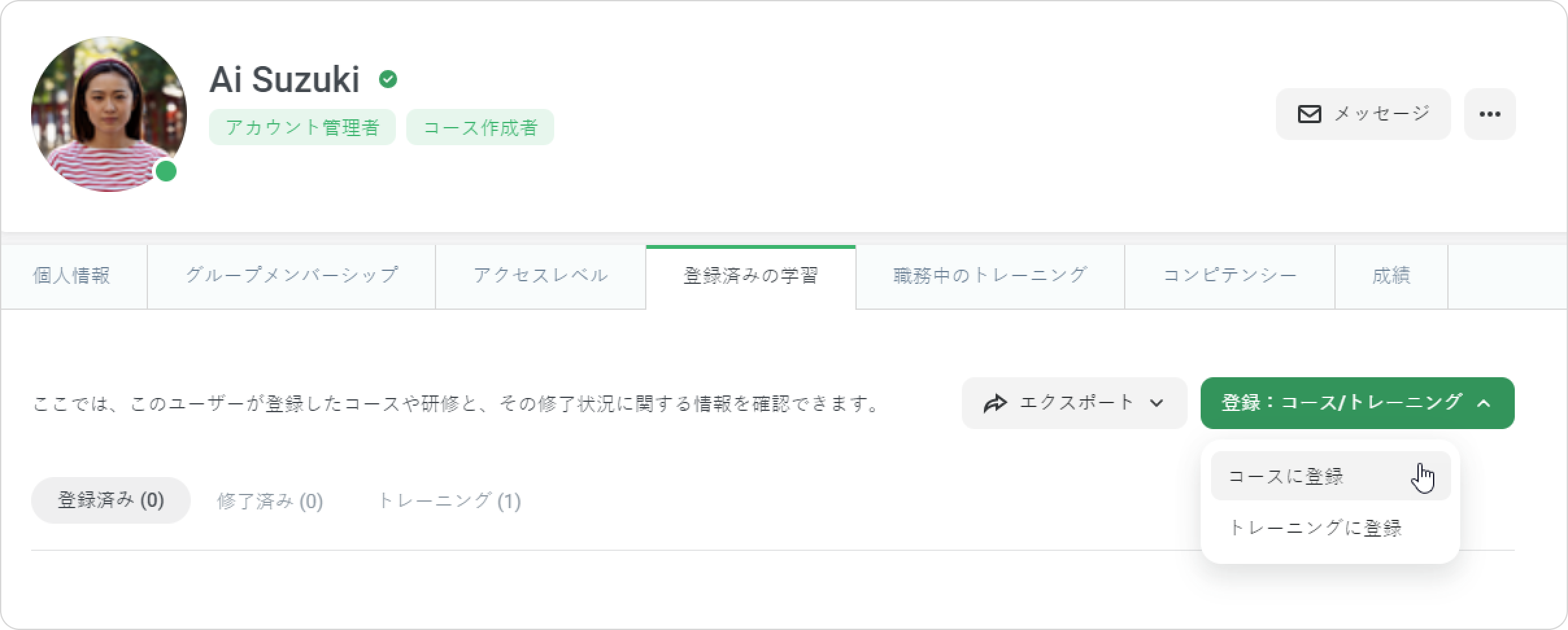 - 登録済みの学習タブを開きます。 次に、登録:コース/トレーニングメニューをクリックし、コースに登録を選択します