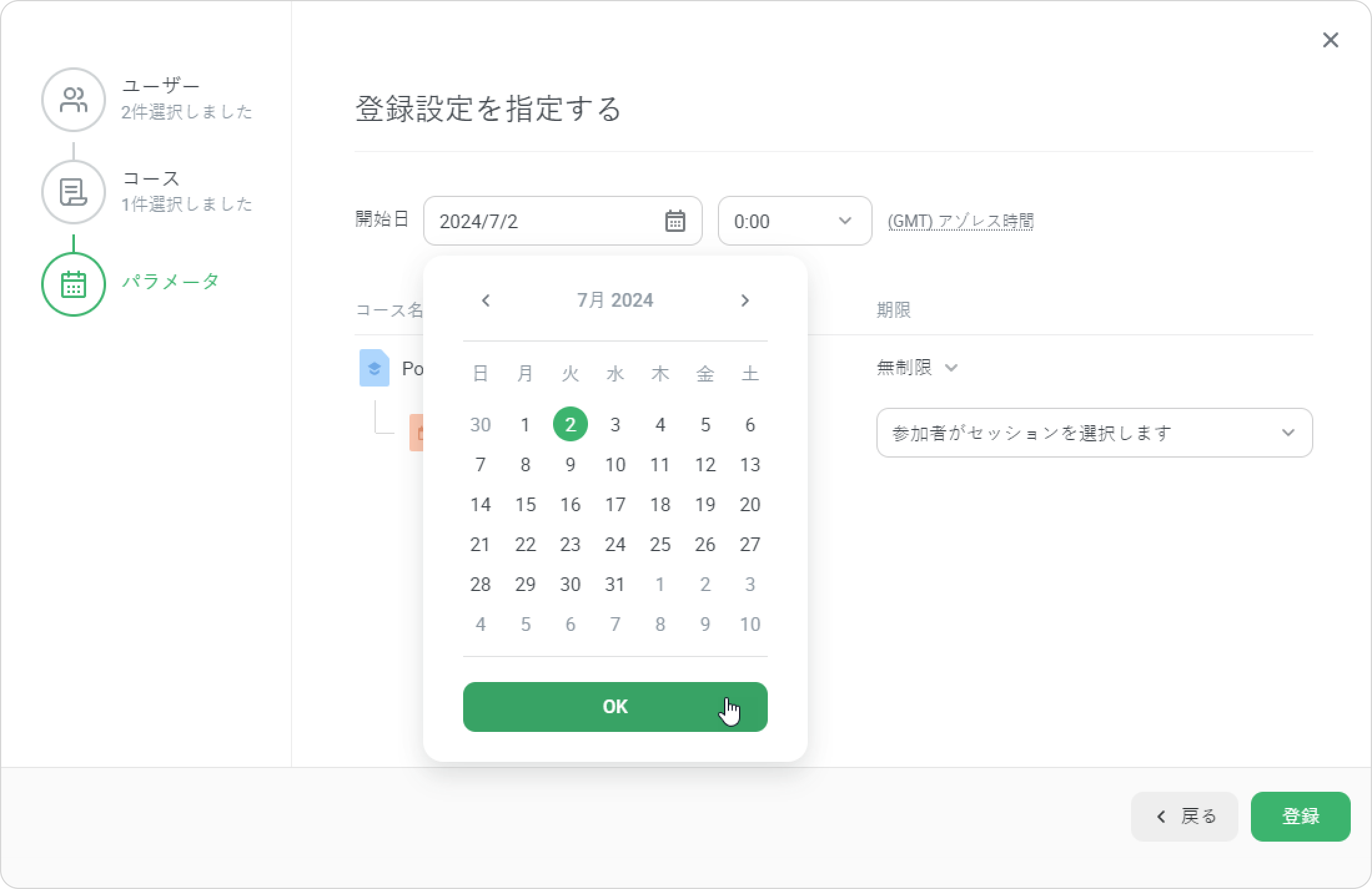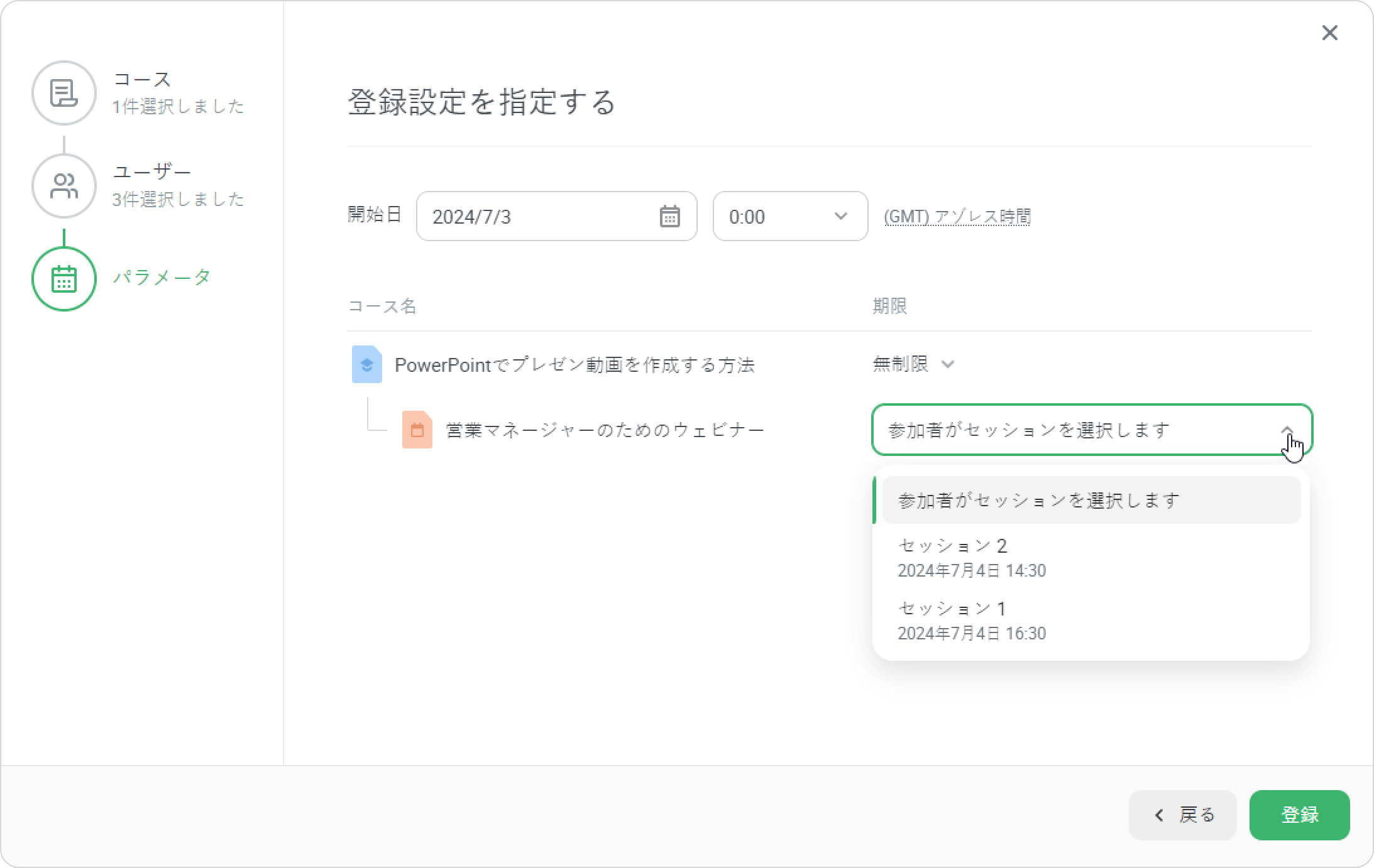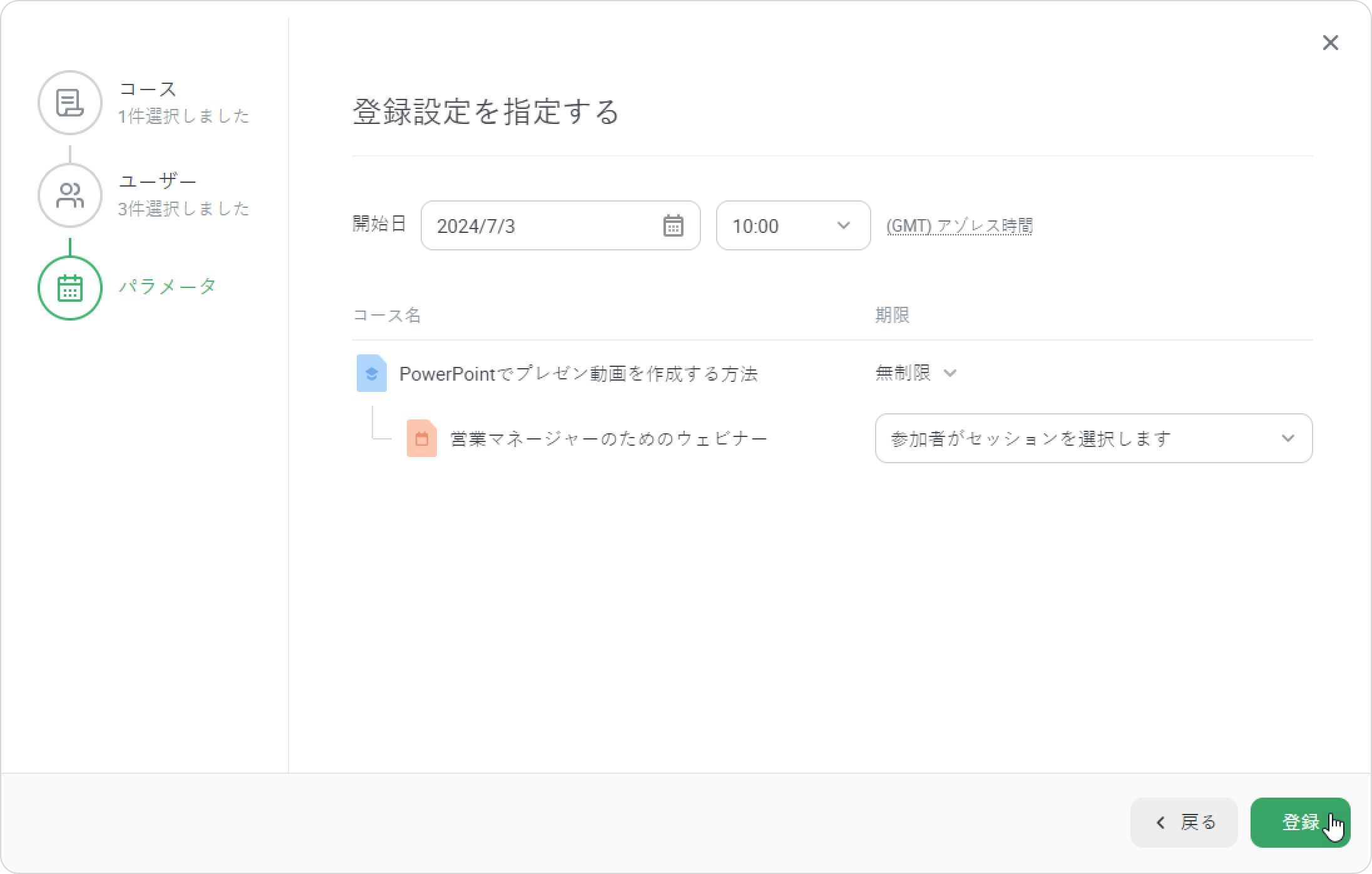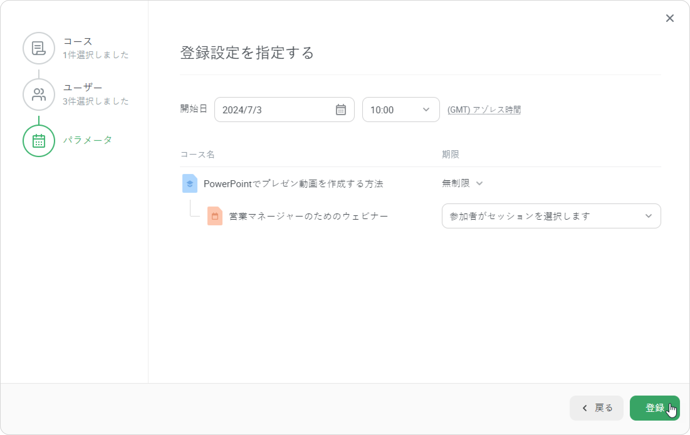 - 登録ウィンドウには3ステージあります。ユーザー →コース→パラメータ。