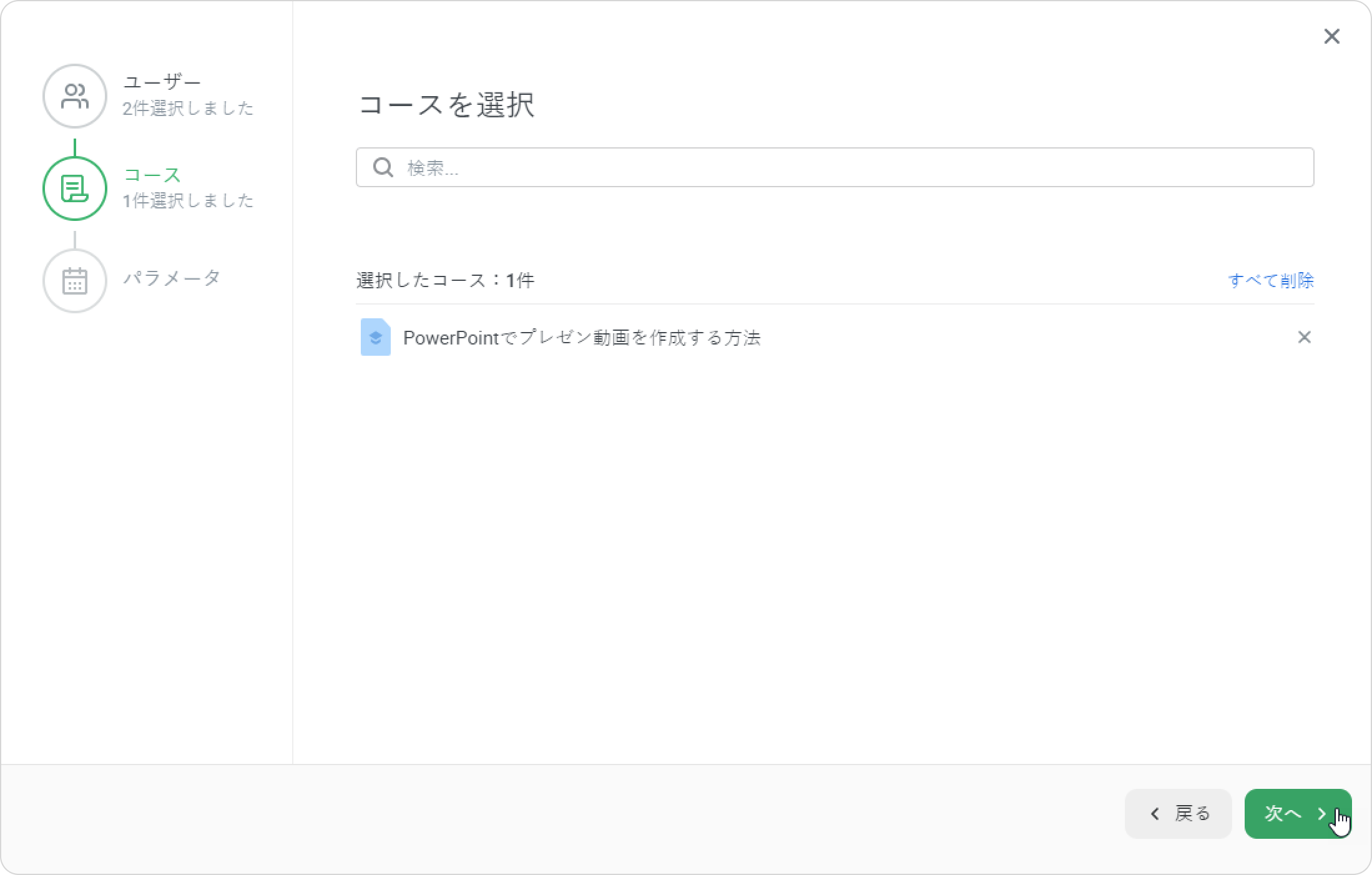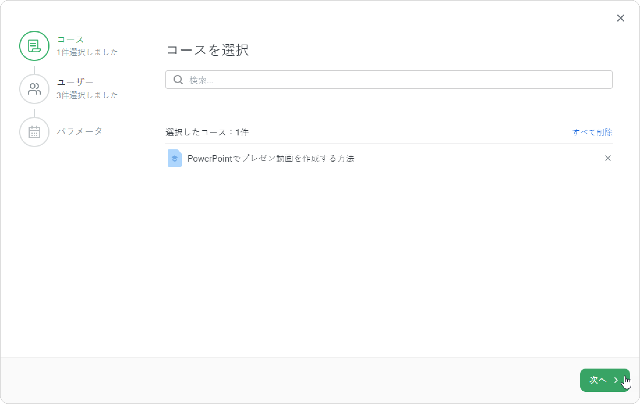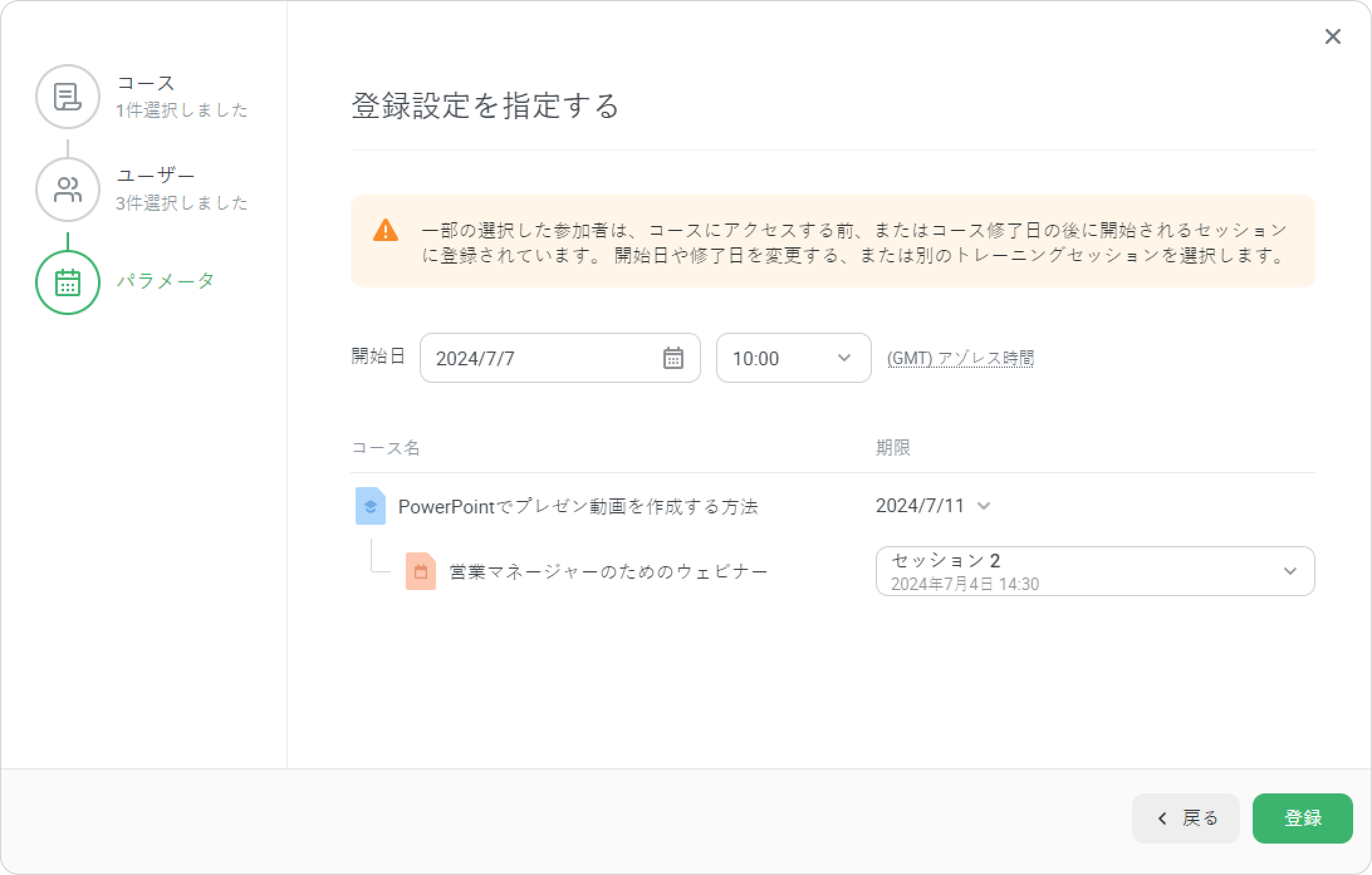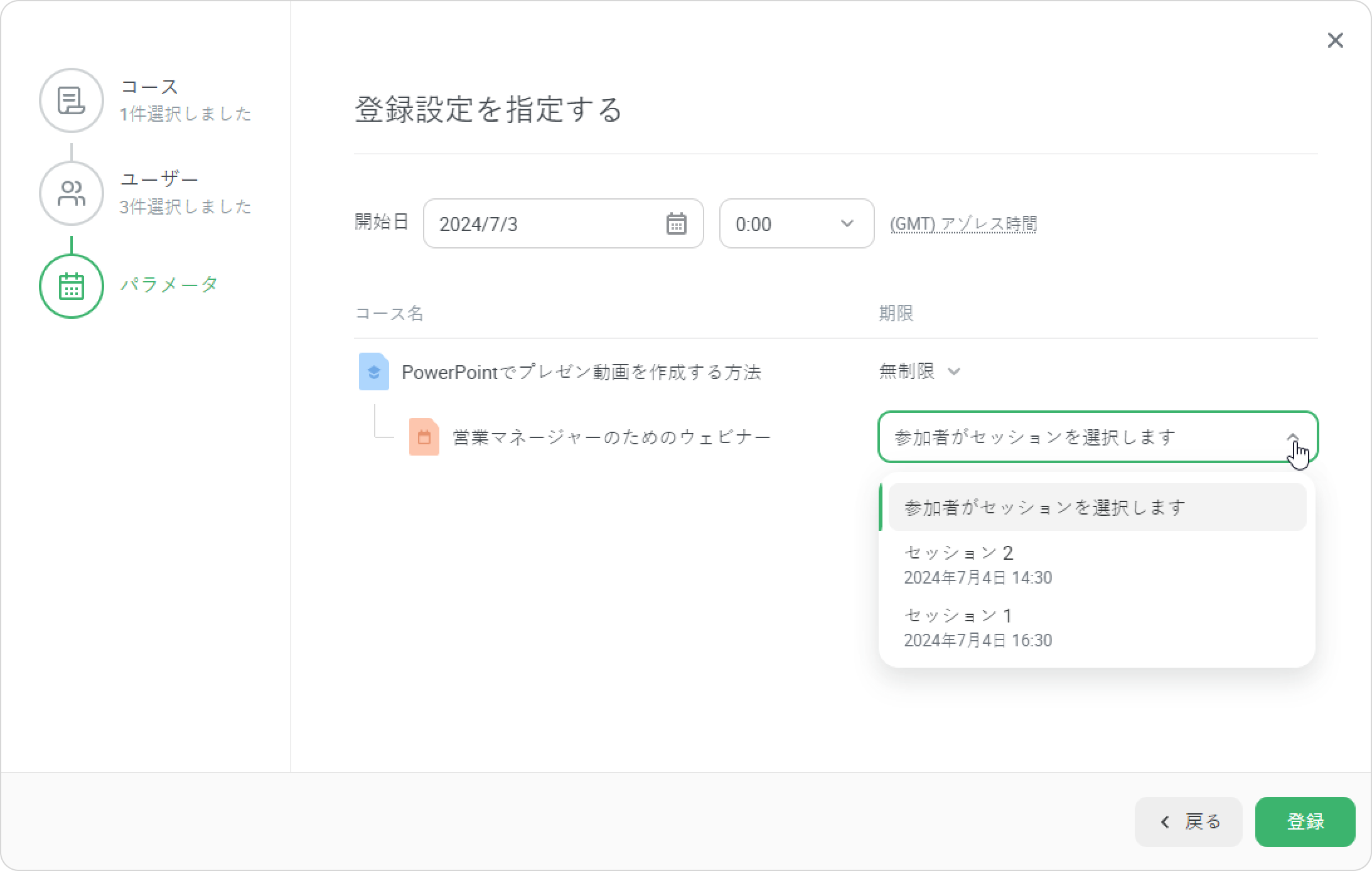 - 登録ウィンドウには3ステージあります。ユーザー →コース→パラメータ。