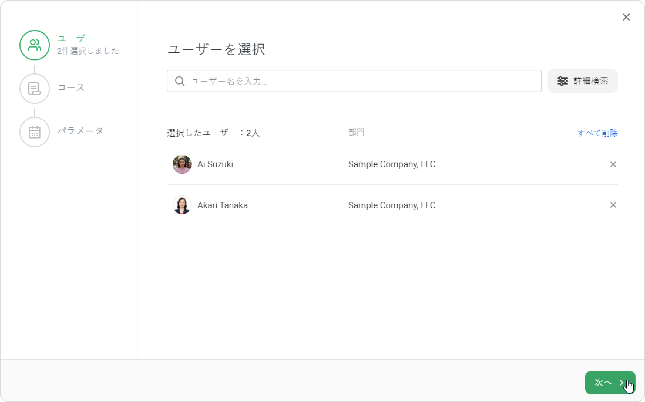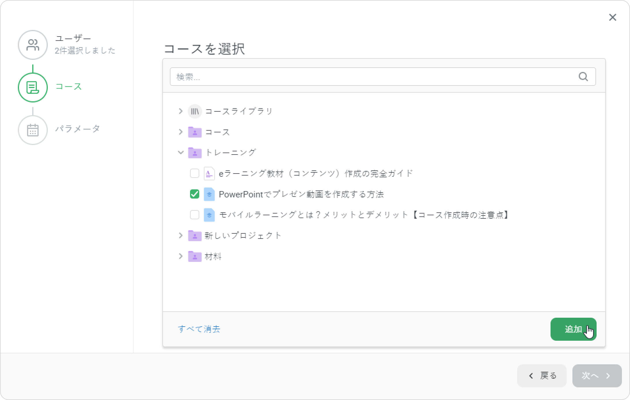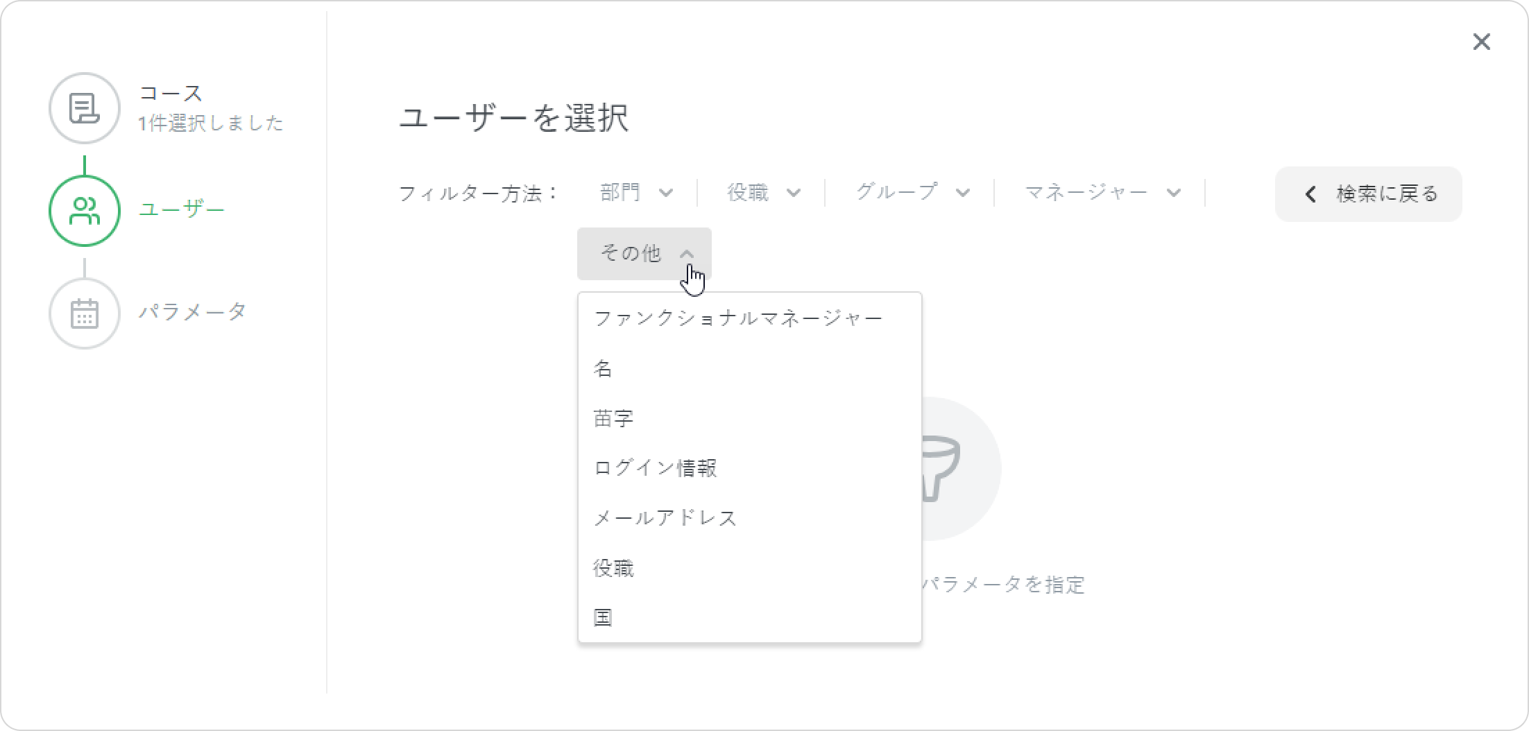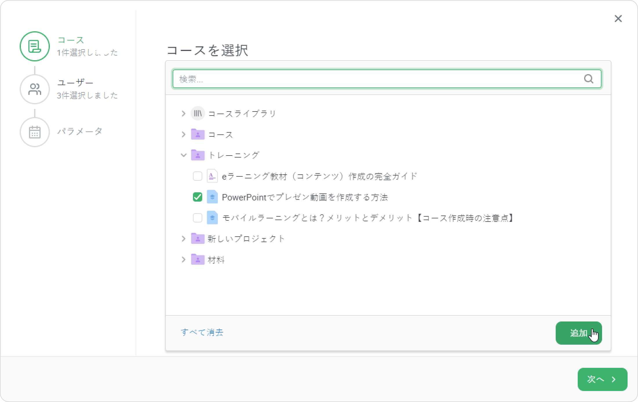 - 登録ウィンドウには3ステージあります。ユーザー →コース→パラメータ。