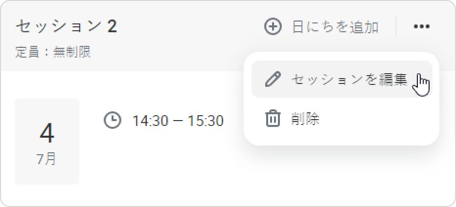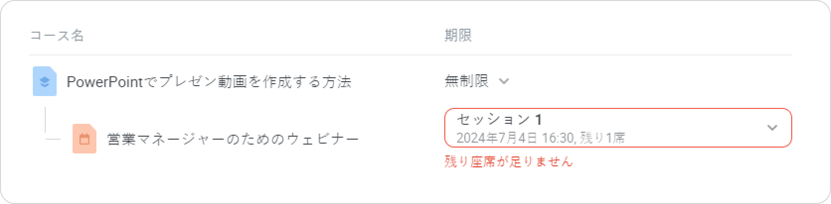 - コースに期限があるなら、コース完了日よりも後に開催されるセッションはメニューに表示されません。
