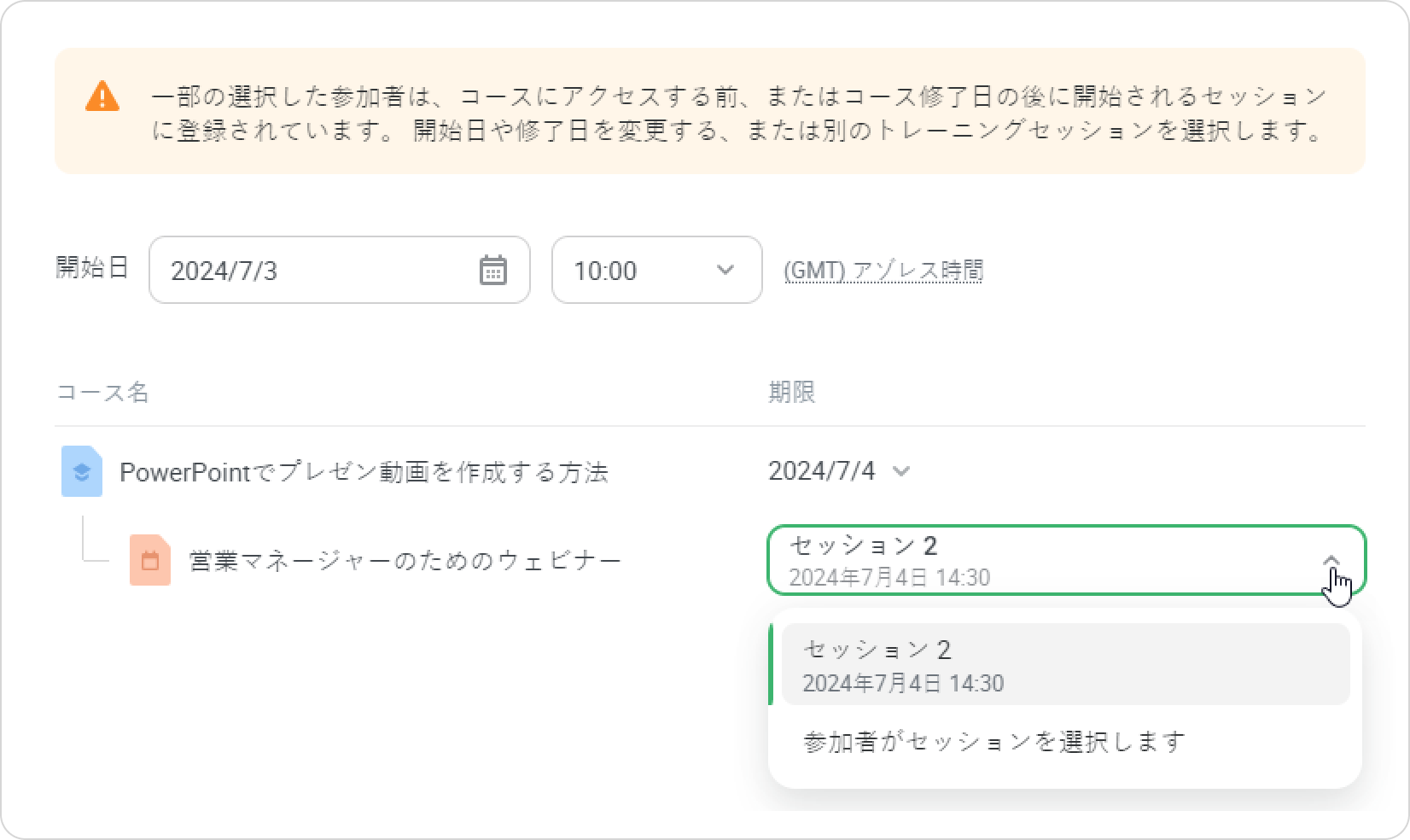 •選択したセッションの開始日を変更すると、そのセッションはコースよりも後に始まります。