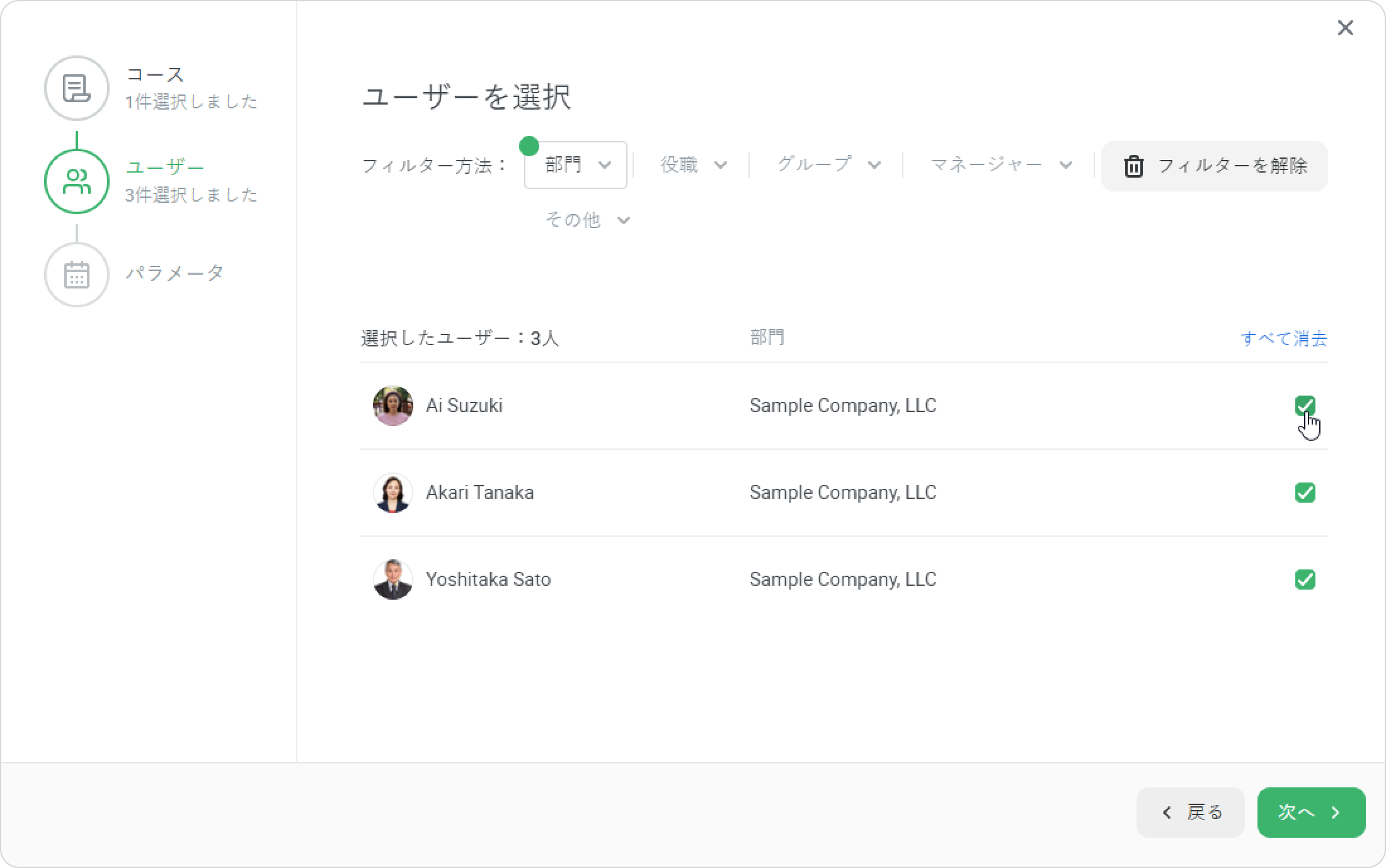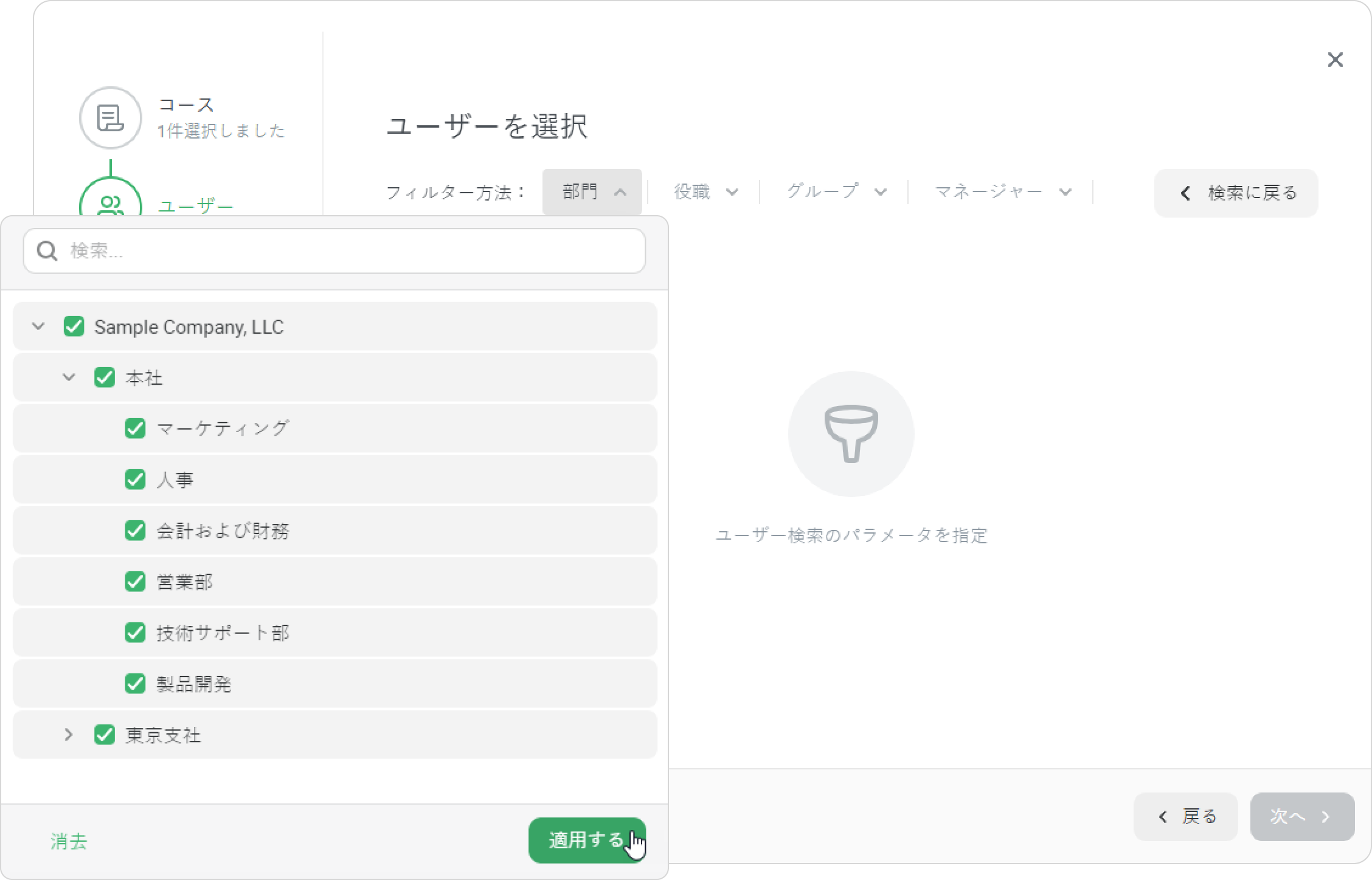 特定の部門や複数の部門に属するユーザーにコースを割り当てます。 例えば、効率的な交渉の規則コースを販売部門全体に割り当てます。