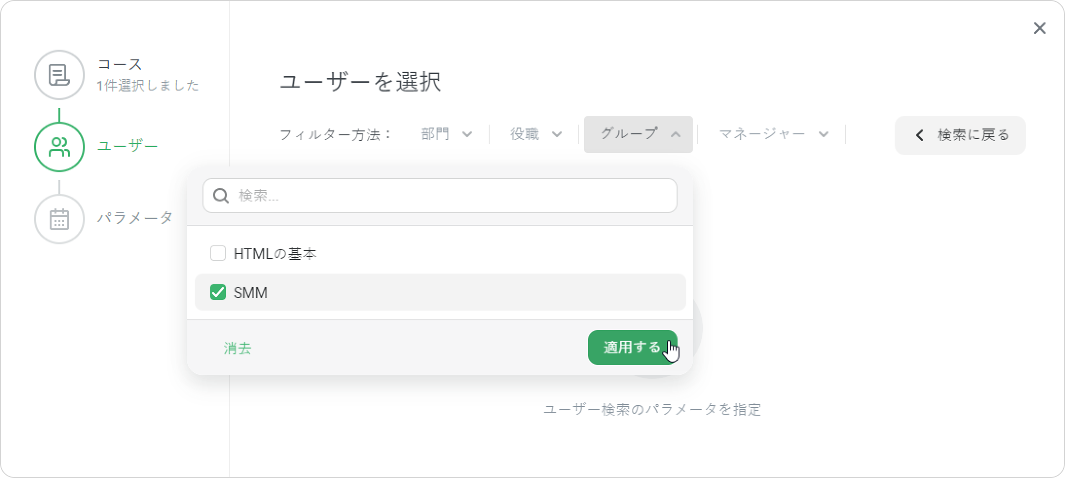 また、コースのユーザーグループ全体を登録することも可能です。 広告ターゲティングコース設定にSMMグループの学習者全員を登録したいとしましょう。