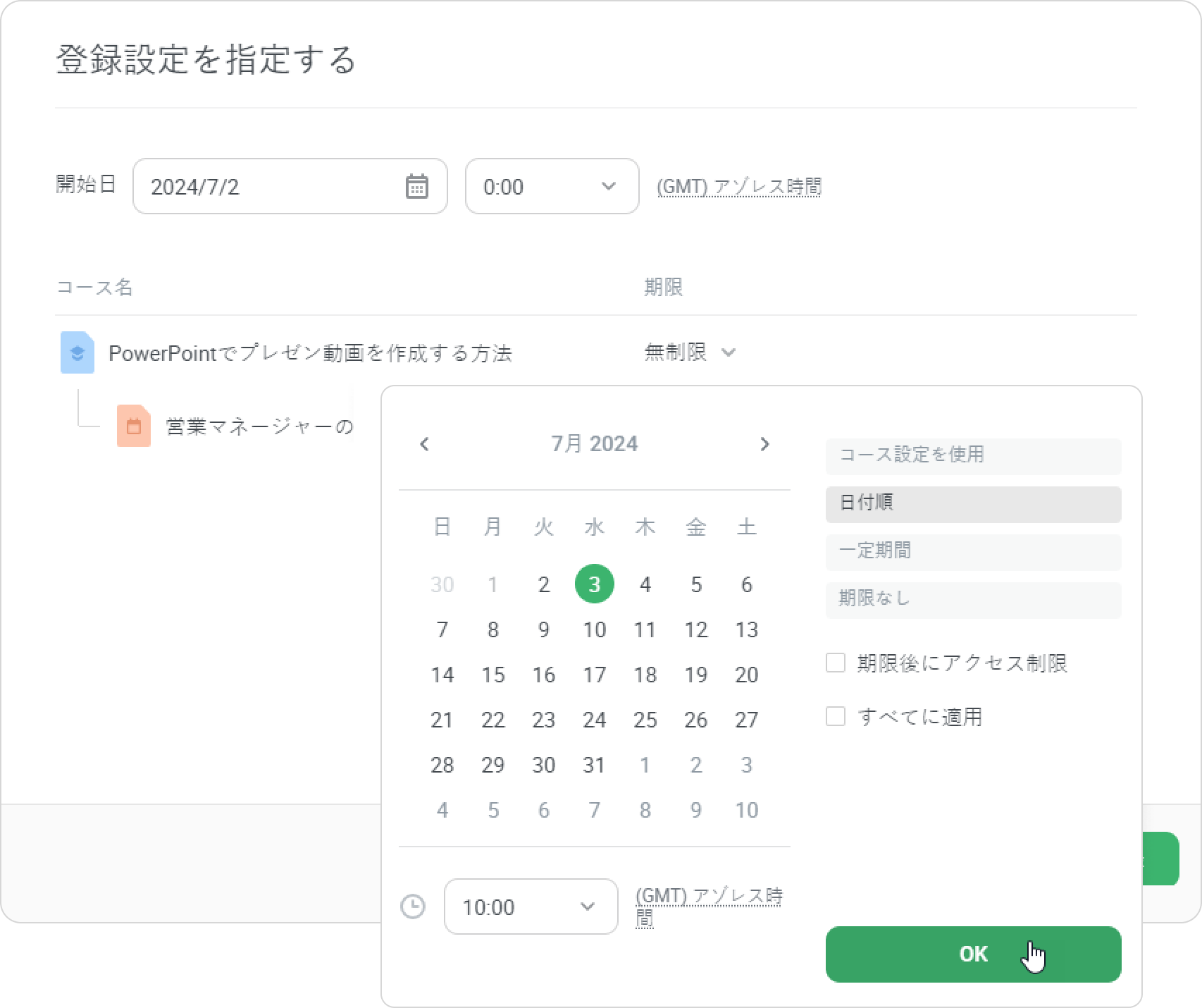 この手順では、コンテンツの学習を始める開始日と時間を設定し、完了日を指定し、トレーニングがコースに含まれているならトレーニングセッションを選択することができます。または学習者に自分でセッションを選択させることが可能です。
