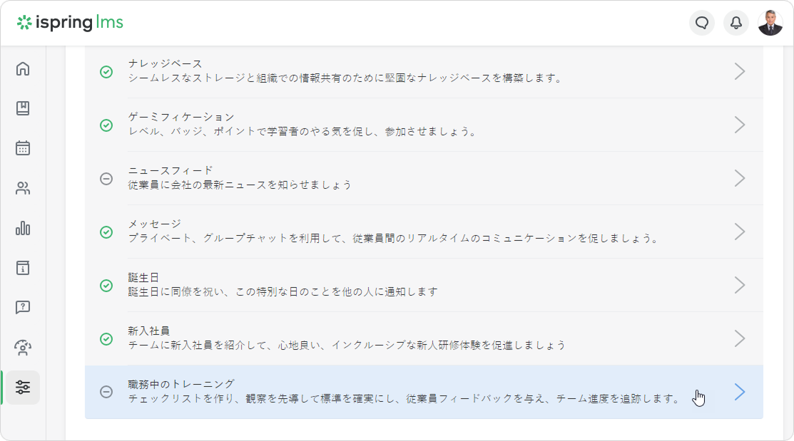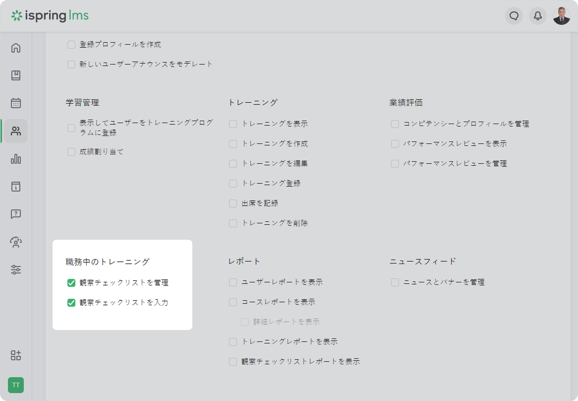 iSpring LMS 設定 追加のオプション Current: 職務中のトレーニング 職務中のトレーニング 設定 > 追加オプションに移動します職務中のトレーニングを選択します次に有効にするをクリックします完了しました! サイドバーで職務中のトレーニングモジュールを見ることができるようになりました。 ここでは観察チェックリストを作成して、トレーニングセッションを案内することができます。職務中のトレーニングセクションへのアクセスこのモジュールは、デフォルトで有効になっています。 アカウント所有者、アカウント管理者、カスタムロールがあるユーザーが無効にすることができます。カスタムロール観察者がユーザーポータルでトレーニングを案内する必要があると仮定しましょう。 iSpring LMSに観察者を追加してカスタムロールを作成し、管理者ポータルへのアクセスがなくてもユーザーポータルでセッションを案内できるようにします。 カスタムロールの作成方法:ユーザー>役割セクションに移動しますそれから新しい役割をクリックします次に役割名を入力し(例えば観察者)、観察チェックリストを管理と観察チェックリストを入力を選択します ×