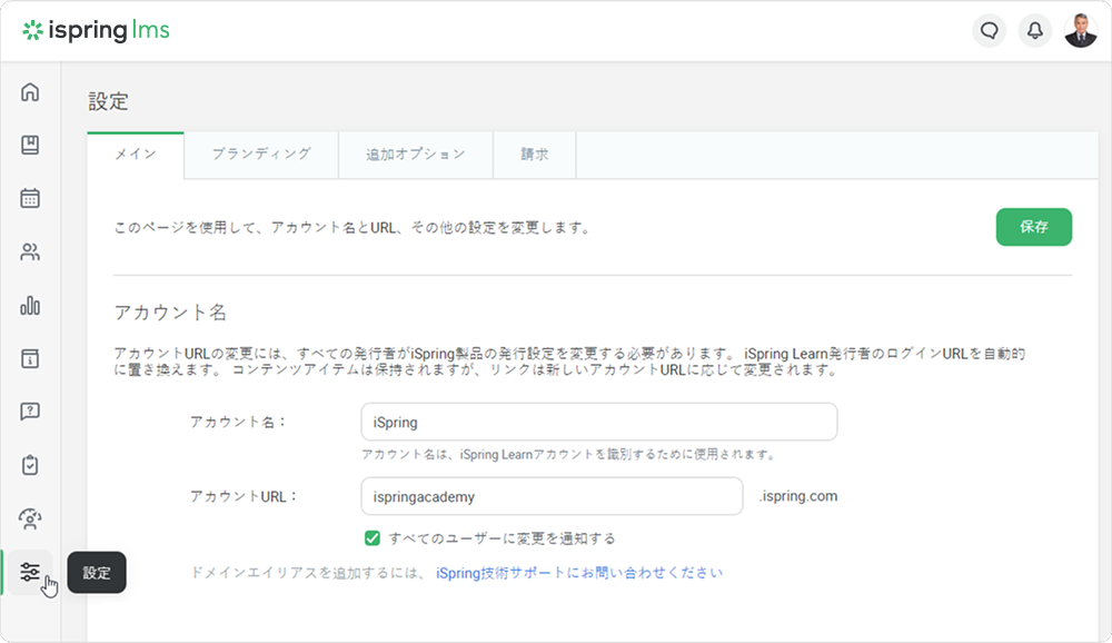 iSpring LMS Current: 設定 設定 トレーニング開始前に、iSpring LMSアカウントの設定をいくつか変えたいかも知れません。 変更をするには、設定セクションを開いてください。 メイン ブランディング 追加のオプション ×