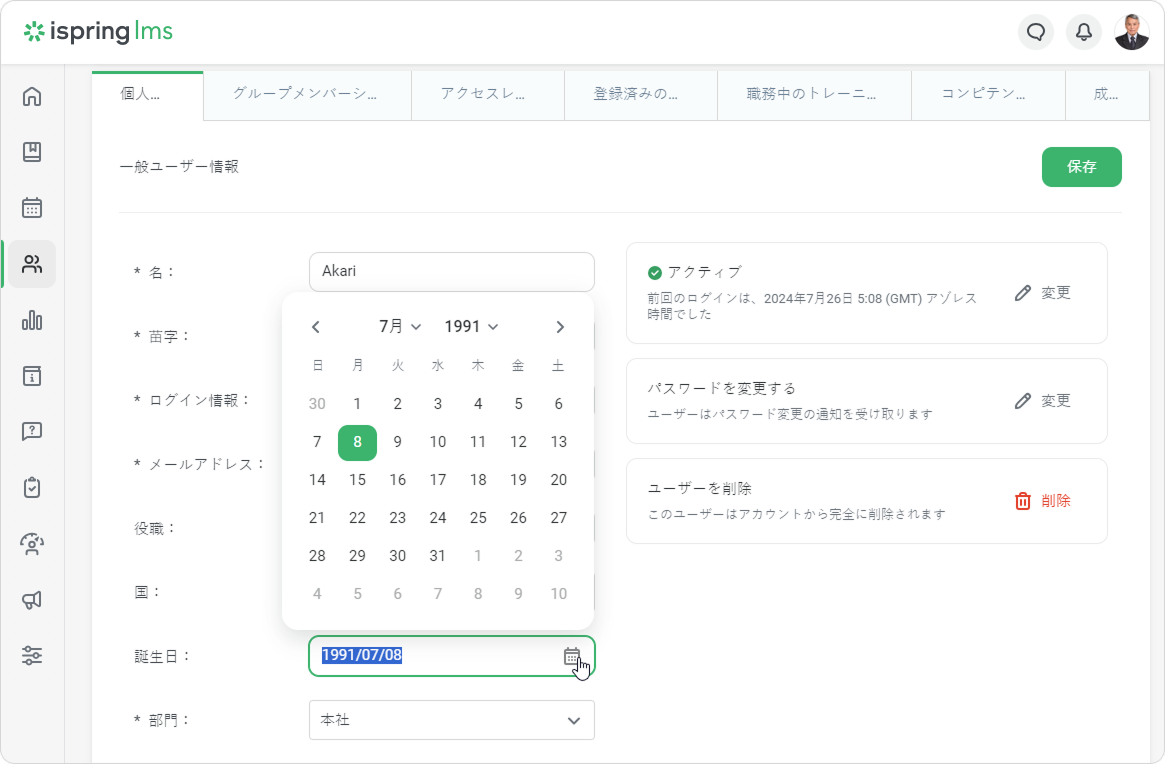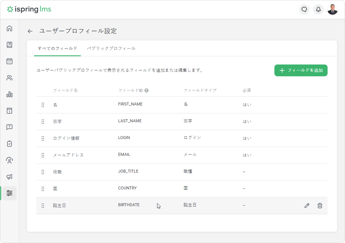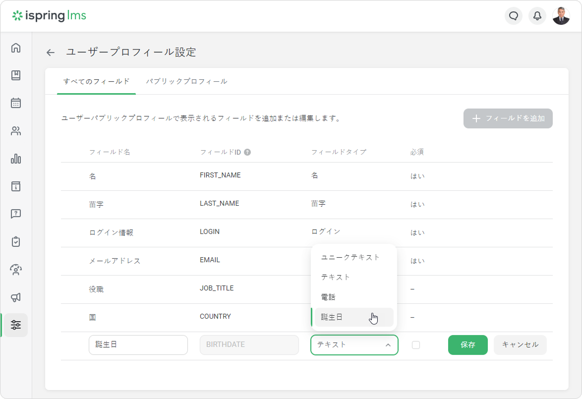 iSpring LMS 設定 追加のオプション 誕生日 Current: 誕生日フィールドを追加する方法 誕生日フィールドを追加する方法 アカウント所有者と管理者のみ設定にアクセスできます。 ユーザーの個人情報ページで、誕生日フィールドを表示する方法:設定 > 追加オプションに移動しますユーザープロフィール設定を選択します誕生日フィールドが有効であることを確認します完了です! ExcelとAPIを介してユーザーを手動で追加する際に、誕生日を追加できます。ユーザーポータルでは、従業員は同僚の誕生日の日・月のみ見ることができます。 管理者のみ生まれた年を見ることができます。 新規アカウントは、デフォルトで誕生日フィールドが有効になっています。 既存のアカウントでは、フィールドは手動で追加できます。 手動で追加するには、誕生日フィールドタイプを選択して 保存をクリックします。誕生日フィールドは必須にもオプションにもできます。このフィールドを削除すると、すべてのユーザーのすべての誕生日データがこのアカウントから削除されます。 設定と組織図の誕生日モジュールは無効になります。 ×
