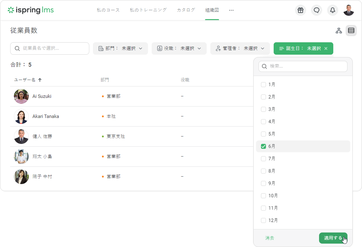 iSpring LMS 設定 追加のオプション 誕生日 Current: 誕生日リストを表示する方法 誕生日リストを表示する方法 組織図を開いて、リストビューをクリックします誕生日フィルターで「月」を選択し、適用するをクリックします完了です! これで、同僚のギフトを準備できます。 ×