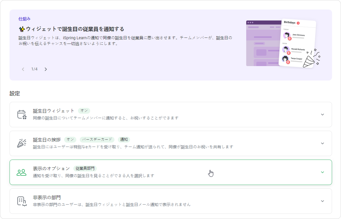 iSpring LMS 設定 追加のオプション 誕生日 Current: 誕生日通知の設定方法 誕生日通知の設定方法 下の誕生日通知に移動します。 モードが有効であるかどうかを確認しますカードに会社の従業員の役職を表示する必要がある場合、スライダーを右にドラッグします挨拶のメッセージを編集します誕生日通知を受け取る人を指定するには、表示のオプションに移動しますメールと通知を受け取る人を選択します 誕生日をお祝いする人と同僚の両者が表示のオプションに従ってメールを受け取ります。 非表示の部門のユーザーは誕生日通知を受け取りません。 よくできました! 誕生日通知を設定しました。 ×