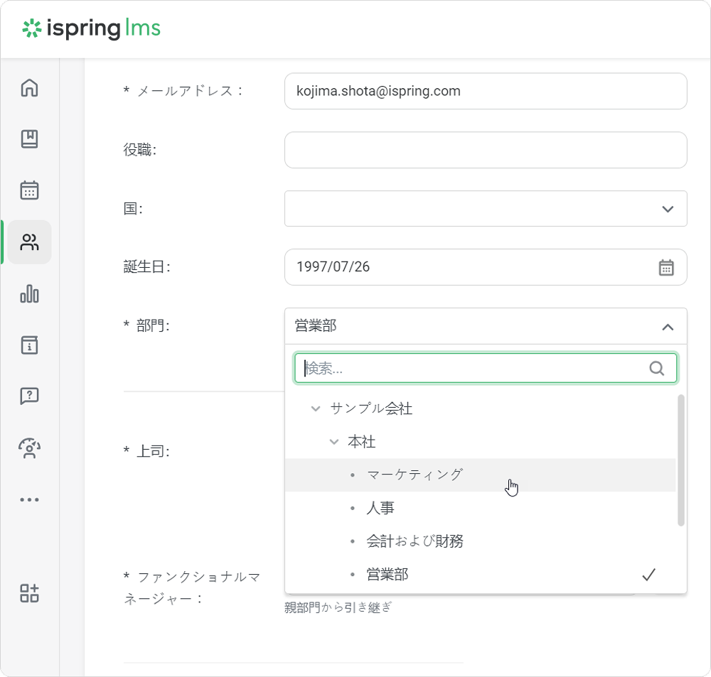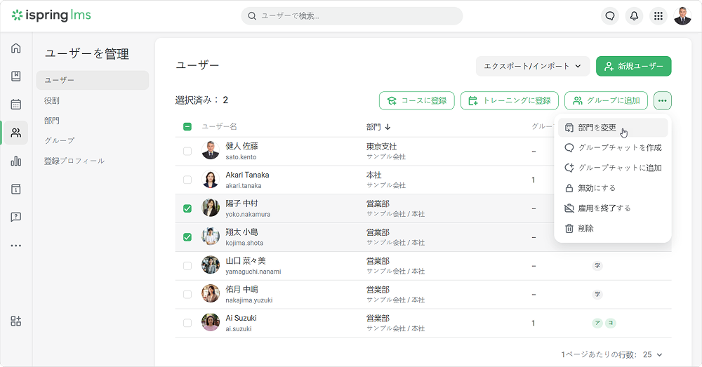 iSpring LMSでは、ユーザーはひとつの部門にしか属することができません。 そのため、別の部門にユーザーを移動したい場合があるかも知れません。