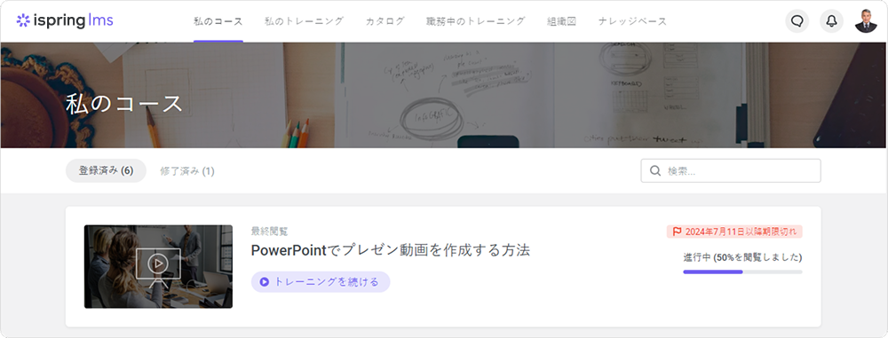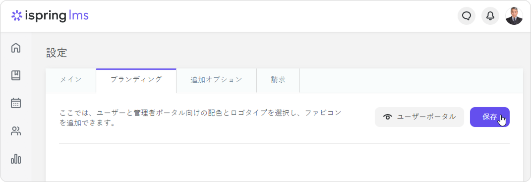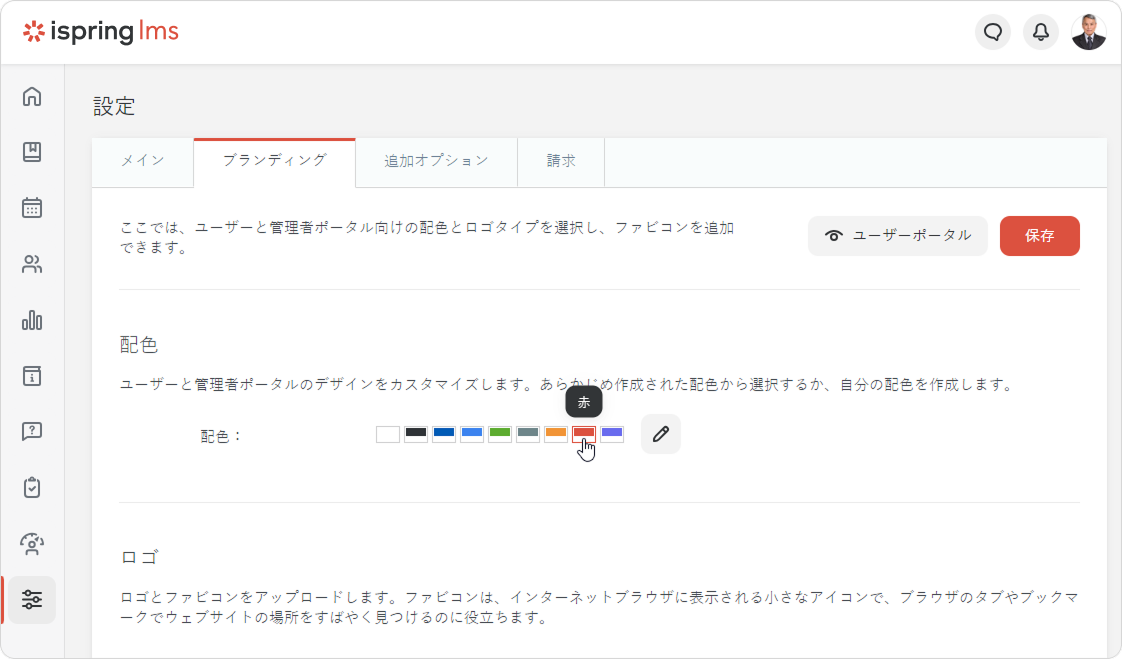 iSpring LMS 設定 ブランディング Current: 配色 配色 iSpring LMSアカウントの配色を選択します。新しい配色設定には2つのオプションがあります。プリセットの配色をひとつ選びますプリセットの配色が合わない場合、自分で色を選びます。 鉛筆アイコンをクリックし、アクセントカラー、トップパネルの背景、テキストカラーを選択しますアクセントカラーボタンやアイコンなど、メインページの全要素の色を定義する色トップパネルの背景管理者とユーザーポータルのトップパネルの色トップパネルのテキストアイコンや刻字など、管理者とユーザーポータルのトップパネルにある要素の色.新しい配色を選択後、変更を保存してくださいこれで、ユーザーポータルボタンをクリックして、更新されたデザインを見ることができます更新されたデザインのユーザーポータルが新しいタブで開かれます ×