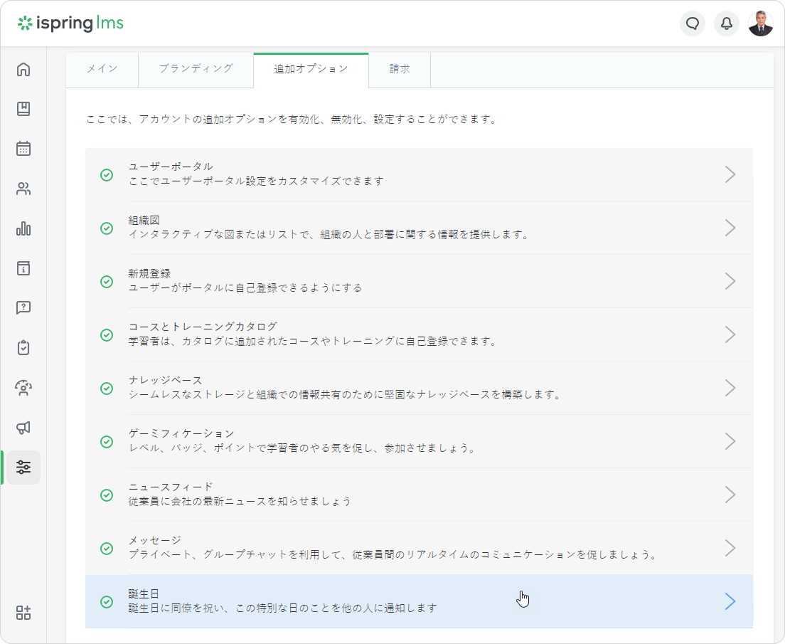 iSpring LMSでは、アカウント管理者は誕生日の時に、誕生日を見ることができる人が会社全体なのか同じ部門の人だけなのかを選べます。 機密性のために、特定の部門で従業員の誕生日を非表示にすることも可能です。 会社に複数の営業所があって従業員数が多い場合に、これは役立ちます。