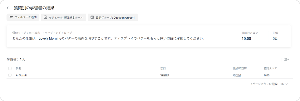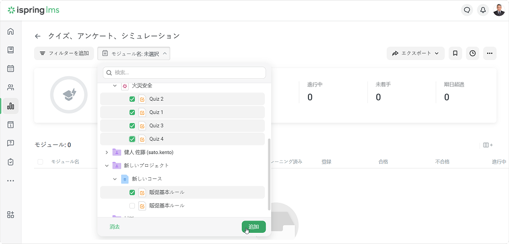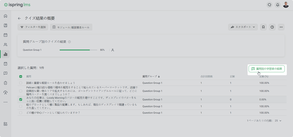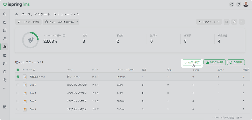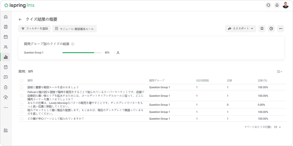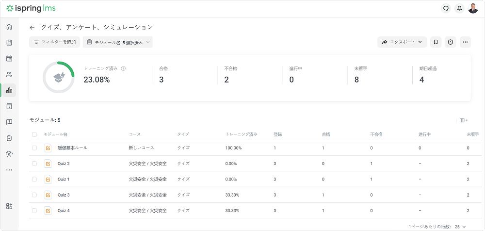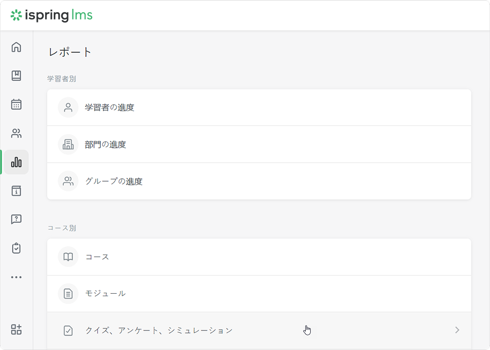 iSpring LMS レポート レポートタイプ Current: クイズ、アンケート、シミュレーション クイズ、アンケート、シミュレーション クイズ、アンケート、シミュレーションでのレポートは、繰り返しのテーマを識別して、より良いトレーニングをまとめるのに役立ちます。 モジュールでレポートを作成し、クイズで質問グループのさらに詳しい統計にアクセスします。 クイズ、アンケート、シミュレーションこのレポートは、コースの一部として、スタンドアローン教材、またはSuiteプレゼンテーション内で作成された合格クイズの結果、アンケート、シミュレーションを表示します。レポートの作成方法:レポートセクションに移動し、コース別セクションにスクロールダウンします。クイズ、アンケート、シミュレーションをクリックしますレポートが開かれますが、空です。モジュール名フィルダーでレポートを実行したいモジュールを選択します 重要:レポートでは10個以上の教材を選択できません。 これで、レポートの準備ができました。 レポート全体の概要は、結果と一緒に表の上に表示されますトレーニング済み生徒のトレーニングレベル。 この値を計算するには、割り当てられたモジュールの合計数で完了したモジュール数を割ってください 合格完了したモジュール数不合格ユーザーが合格できなかったコース数進行中ユーザーが開始したが完了していないモジュールの合計数未着手 学習者がまだ始めていないモジュールの合計数期日超過T期限がすでに切れたコース数クイズ結果の概要レポートは、クイズの質問グループの正解・不正解の合計数と割合を追跡するのに役立ちます。 重要:このレポートは、採点済みクイズにのみ使えます。 レポートを実行する方法:モジュールリストでクイズを選択し、結果の概要ボタンをクリックしますクイズ結果の概要レポートが開きますクイズ結果の概要 レポートは表と質問グループの概要で構成されます:質問グループ別のクイズの結果概要で表示されるもの質問グループのタイトル質問グループの回答合計数の正解の割合質問統計表で表示されること:質問リスト質問グループ全従業員の正解・不正解の合計数と割合各質問の平均点 f 重要:クイズに1つ以上の質問グループが入っている場合、質問グループフィルターが表示されます。 概要のグループ名をクリックして、質問グループでレポートをフィルターできます。 質問別の学習者の結果このレポートは次のことを見るのに役立ちます:ユーザーの回答が正解か不正解かこの質問で獲得したスコアレポートを実行する方法:リストの質問を選択し、質問別の学習者の結果をクリックします質問別の学習者の結果レポートが開きます 重要:質問に計算式が入っている場合、アカウント管理者は質問のテキストと計算式を見ることができます。エッセイとリッカート尺度の質問では、正解/不正解列ではなく、回答済み列が表示されます。 ×