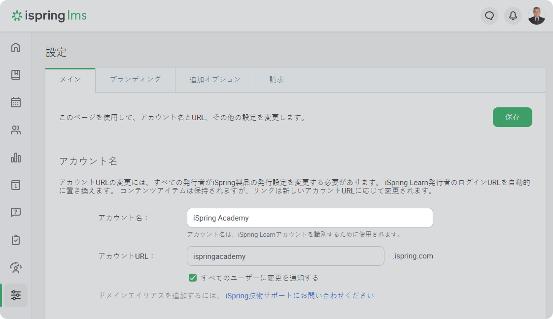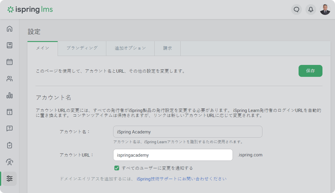 iSpring LMS 設定 メイン Current: アカウント名とURL アカウント名とURL このセクションでは、iSpring LMSアカウントのどの名前やURLも設定できます。 アカウント名の変更アカウント名は、iSpring LMSアカウントを識別するために使用され、メール通知で表示されます。変更するには、アカウント名フィールドに新しい名前を入力します保存ボタンをクリックしますアカウントURLの変更URLの最初の部分を社名やお好きなものに変更できます。 変更方法をご紹介します:アカウントURLフィールドにアカウントの新しいURLを入力します。次の文字を使用できます:ラテン文字(A-Z、a-z)、数字(0-9)、ダッシュ(—)保存ボタンをクリックします アカウントURLが変更されたという通知が表示されます。 数秒後、自動的に新しいURLに切り替えられ、そこで再度ログインする必要がありますアカウントユーザー全員に、URL変更について自動的に通知されます。 メール通知を受け取らせたくない場合には、すべてのユーザーに変更を通知するのチェックを外してください アカウントURLの変更には、iSpring Suiteの公開設定を変更する必要があります。 以前のアドレスを新しいアドレスに変更する必要があります。 アカウントのすべての情報は維持されますが、すべてのコースURLは変更されます。 ドメインエイリアスiSpring LMSアカウントで追加のドメイン名を使用したい場合には、iSpringサポート部にお問い合わせください。 ×