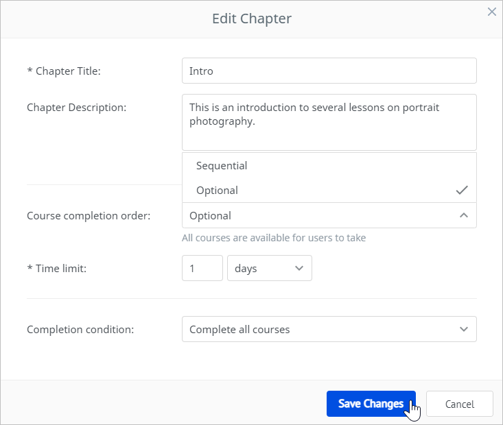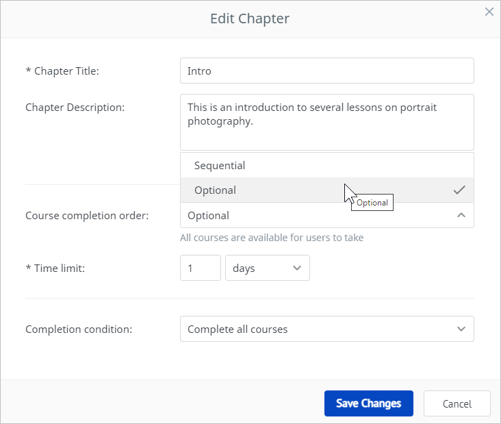 Choose whether users take the chapter courses in sequential order or in the order they choose (optional order). Taking course chapters in an optional order is selected by default.