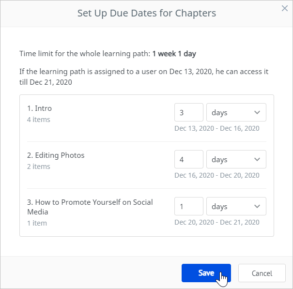 - In the Set Up Due Dates for Chapters window, specify how long chapters will be available to users and click Save.