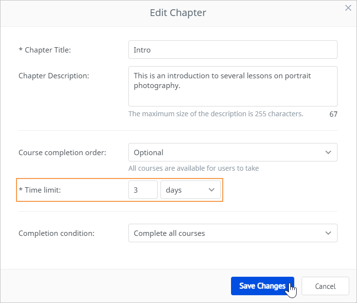- In the Edit Chapter window, set the Time limit and click Save Changes.
