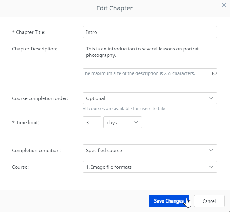 If you select Complete all courses, users will have to complete all courses to get the chapter marked as passed. In case you choose Specified course, learners will need to complete one selected course to pass the chapter.
