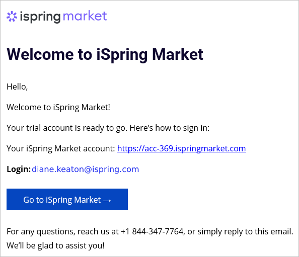 You will receive an email with a link to your iSpring Market trial account. Follow the Go to iSpring Market link.