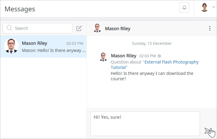 Regular users can reply to messages but are not permitted to start a chat on their own. However, if an instructor is assigned to a course, students can send them their questions.