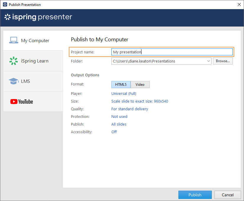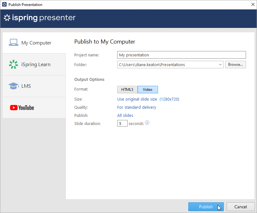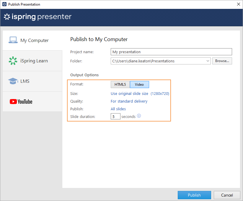 If you've specified the duration for each slide in the PowerPoint presentation or configured the animation effects to be played automatically, then this time will be taken into account in the final video. If your presentation consists of slides of different lengths, then adjust the duration of the slide show for each slide by specifying the time for changing slides in PowerPoint.