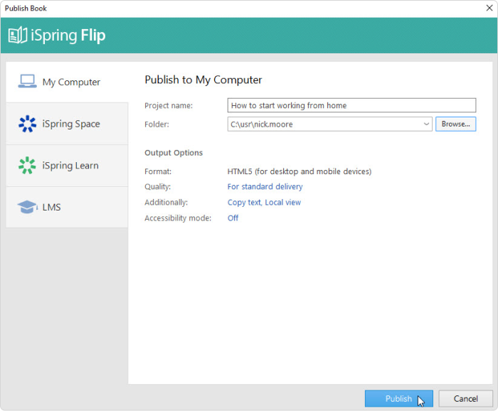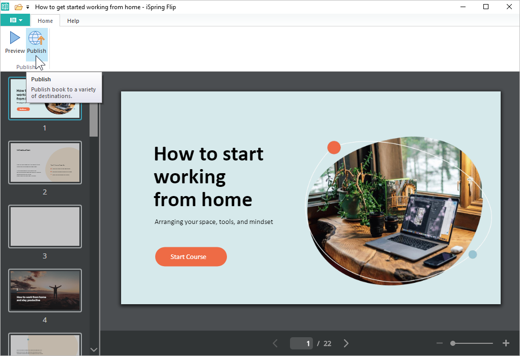 iSpring Suite includes the iSpring Flip tool that allows you to create flipbooks from PowerPoint presentations, and Word and PDF documents. A flipbook cannot be added to a course but can be sent out to learners so they always have this information at their fingertips.