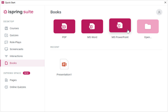 - Launch the iSpring Suite program and, in the Quick Start window, select the Books tab. Next, choose the type of document that you would like to convert to a flipbook and open it.