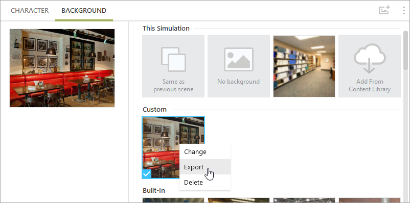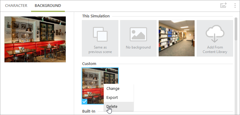 The new background will appear in the Custom area of the Background Library. You can replace it with a new picture, export it or delete.