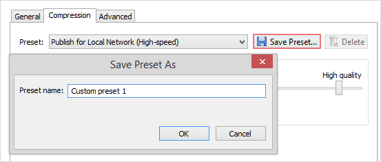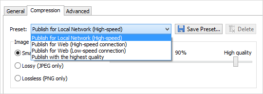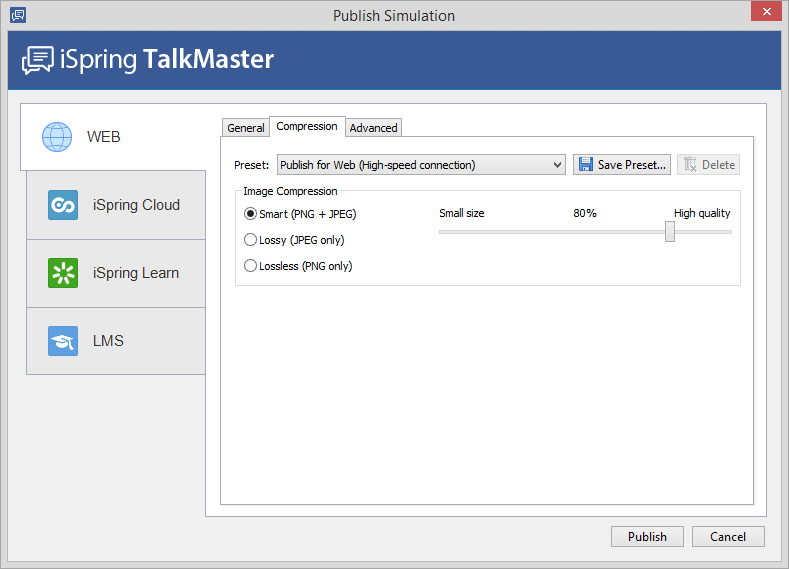 iSpring TalkMaster offers four preset compression modes that optimize a simulation for the web with low or high connection speed, publishing it to the Local Network drive. You can also create up to five custom compression presets to suit your needs.