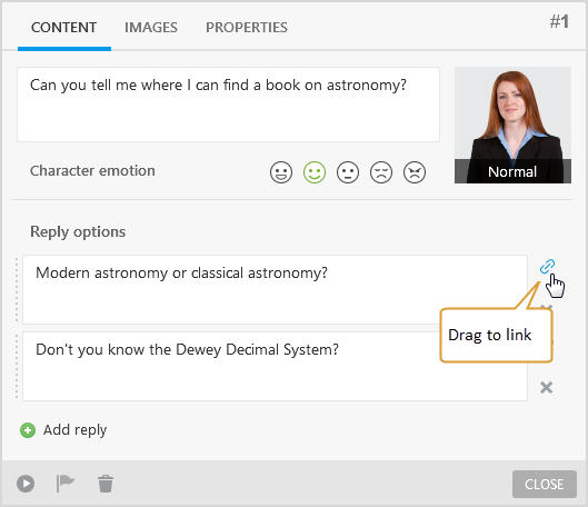 7. When you’re done adding replies, you can start linking them. Click and drag the link icon off the scene simulation to create a new scene that’s linked to that answer.