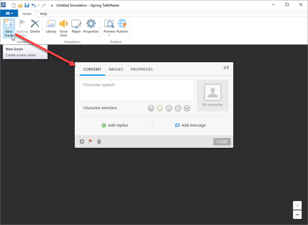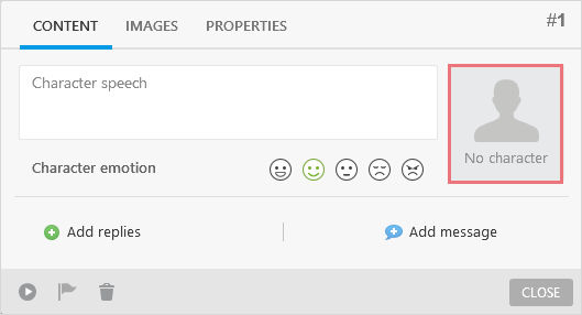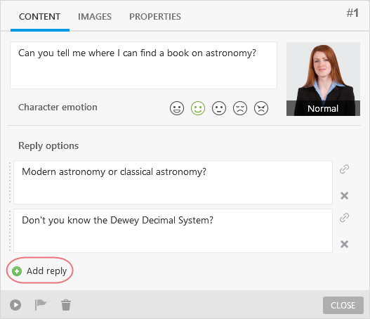 5. Back on the Content tab, enter some text for the character to say, and then click Add replies to give the user some choices as to how to respond to the character.