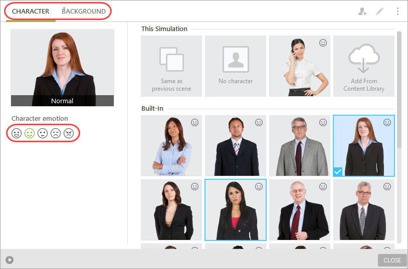 3. The character gallery will open up. Choose a character to appear in this scene, and then go to the Background tab to choose a background from the background gallery. When you’re done picking your character and background, click Close.