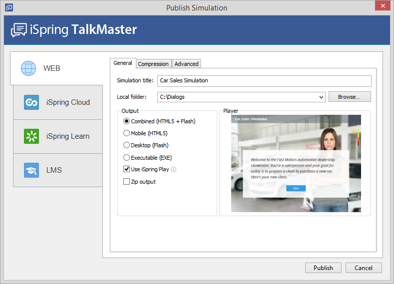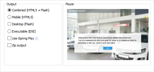 | Executable (EXE) | If selected, iSpring TalkMaster generates an executable (.exe) file with the Flash output. It can be displayed everywhere, even if you don't have the Flash Player installed. To view the simulation, run the .exe file in the output folder with the name that you specified while publishing. |