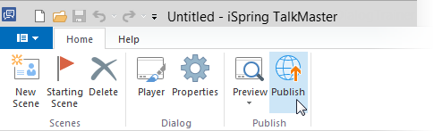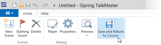 If you open iSpring TalkMaster from iSpring Suite but not as a standalone application, you can add the current simulation to your course by clicking Save and Return to Course on the toolbar and return to your PPT presentation. Or use the publish option in the Application menu.